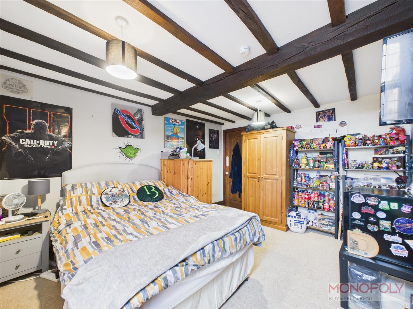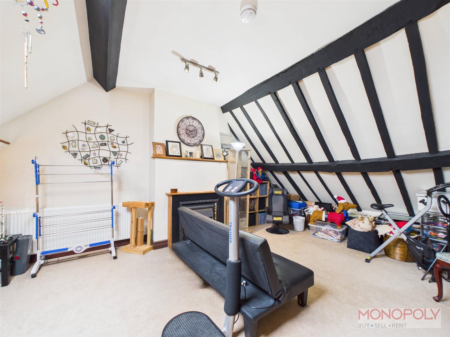 Velux skylight, eave storage to either side, beams to ceiling, two ceiling light points, two radiators and carpet flooring.