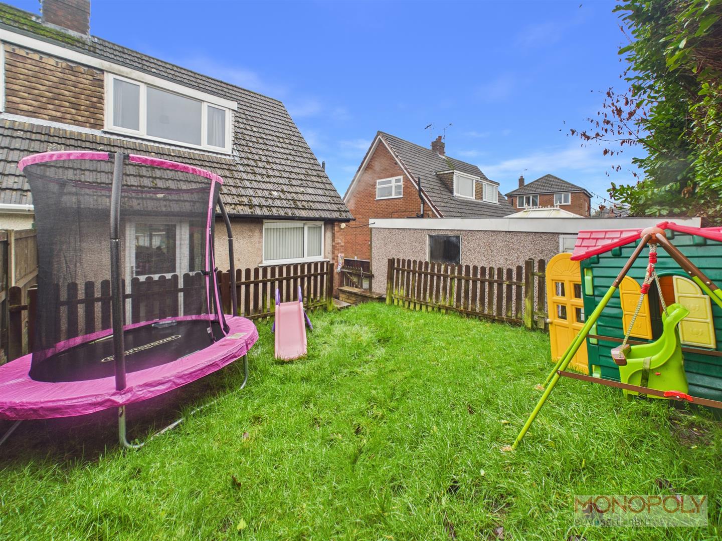 Rear - Hardstanding area adjacent to the house, steps up to lawn, path to garage pedestrian door.