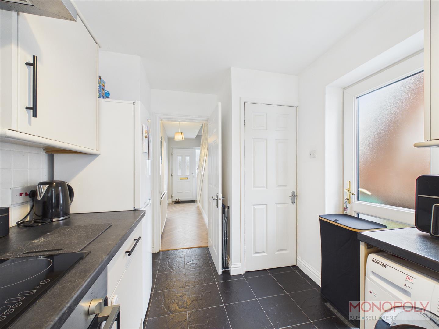 Fitted kitchen with a range of wall and base units, single oven, hob, extractor, stainless sink/drainer, space for washing machine, wall mounted gas boiler, tiled flooring, window to rear, door to side, door to pantry cupboard with power.