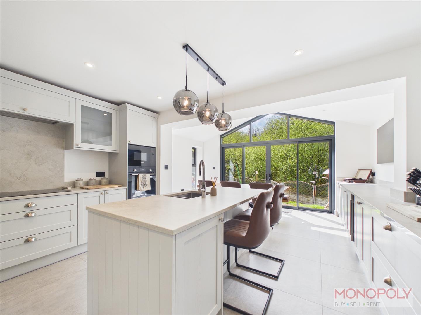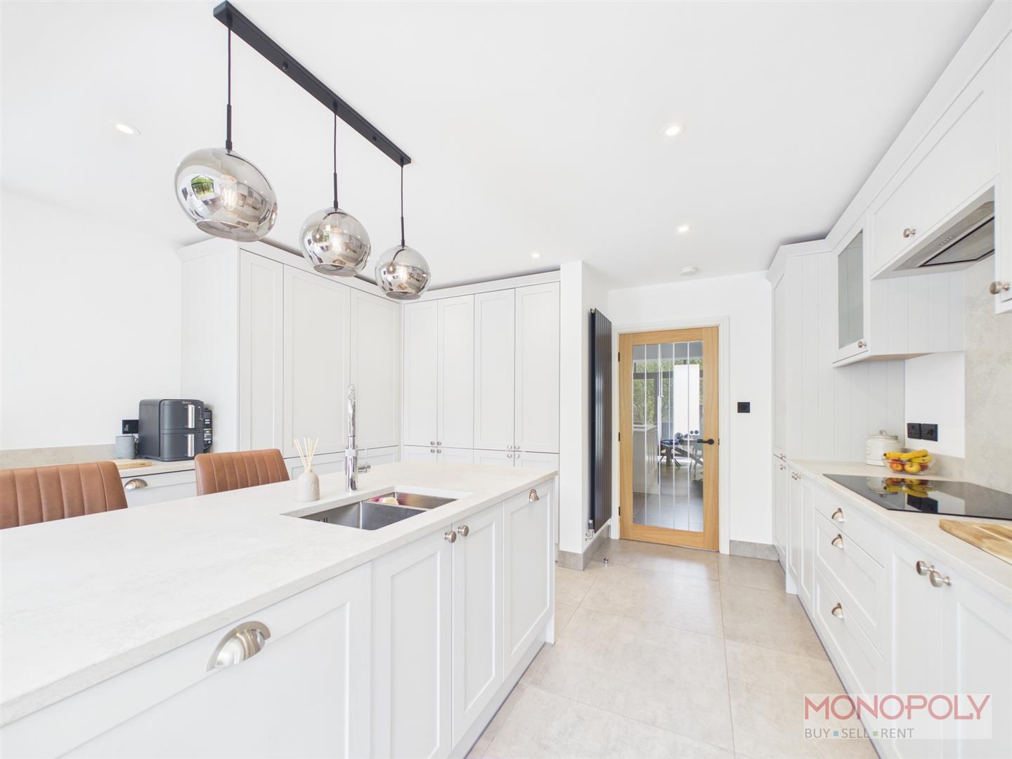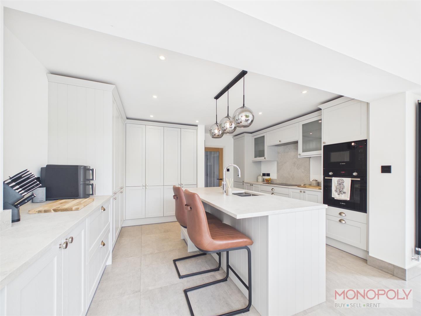 A high specification fitted kitchen with central island, a range of wall and wall units, complementary textured quartz worktops, induction hob, extractor oven and microwave, inset sink/drainer with Quooker instant hot water tap over, dishwasher, fridge/freezer, pull out waste disposal unit, wine chiller, contemporary vertical radiator, tiled floor, spotlights to ceiling, feature open plan into dining area.