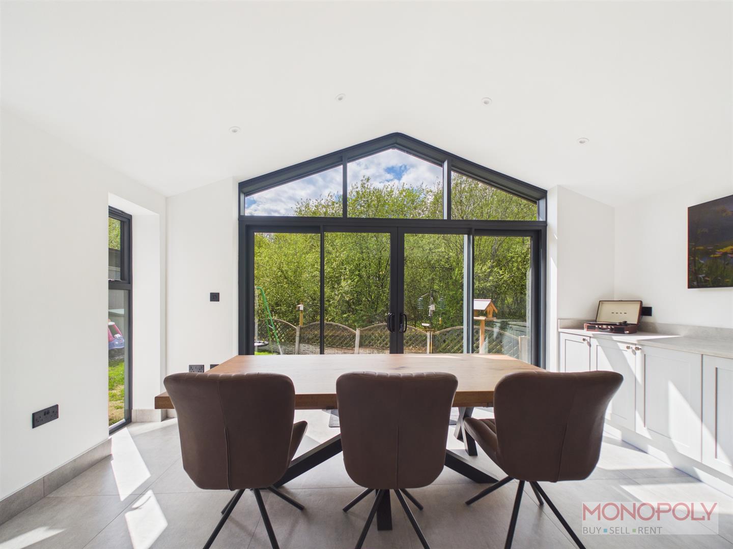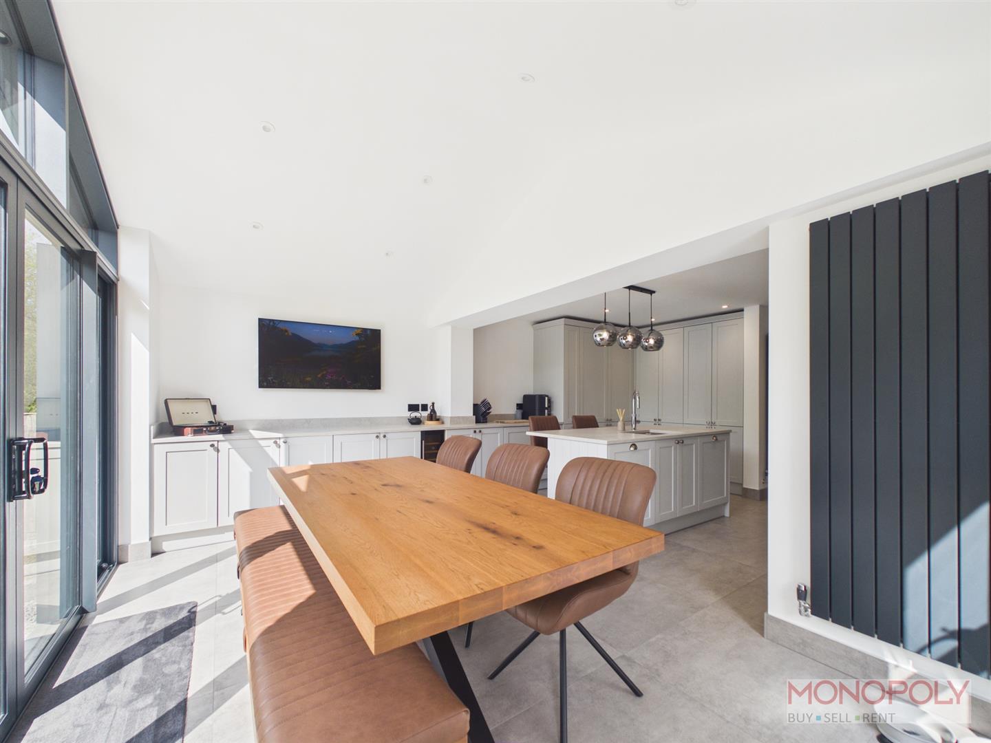 Located in the rear extension a brilliant space open plan off the kitchen filled with natural light. Two windows to side, sliding doors to rear garden with further glazing over, spotlights to ceiling, contemporary vertical wall radiator.