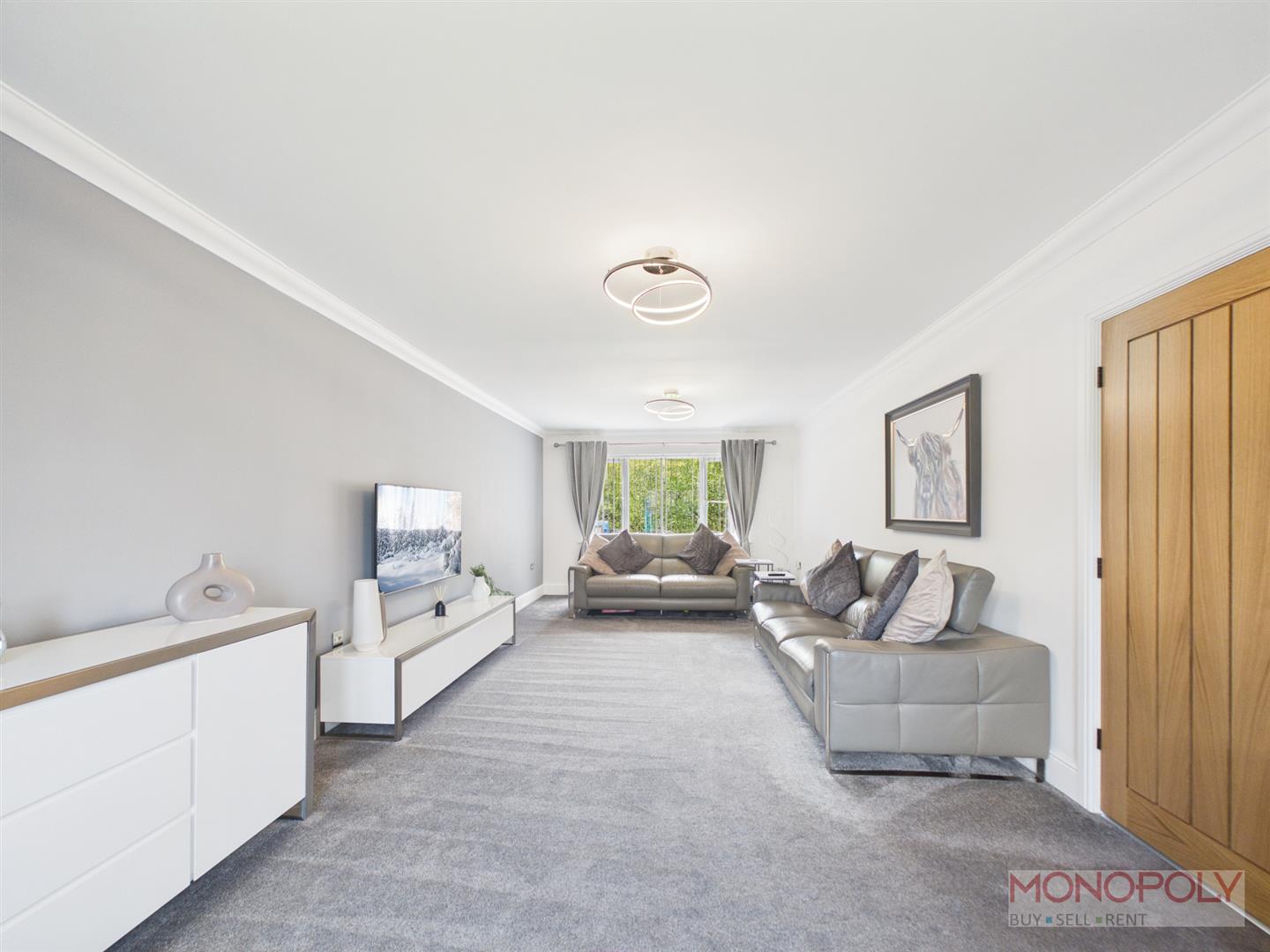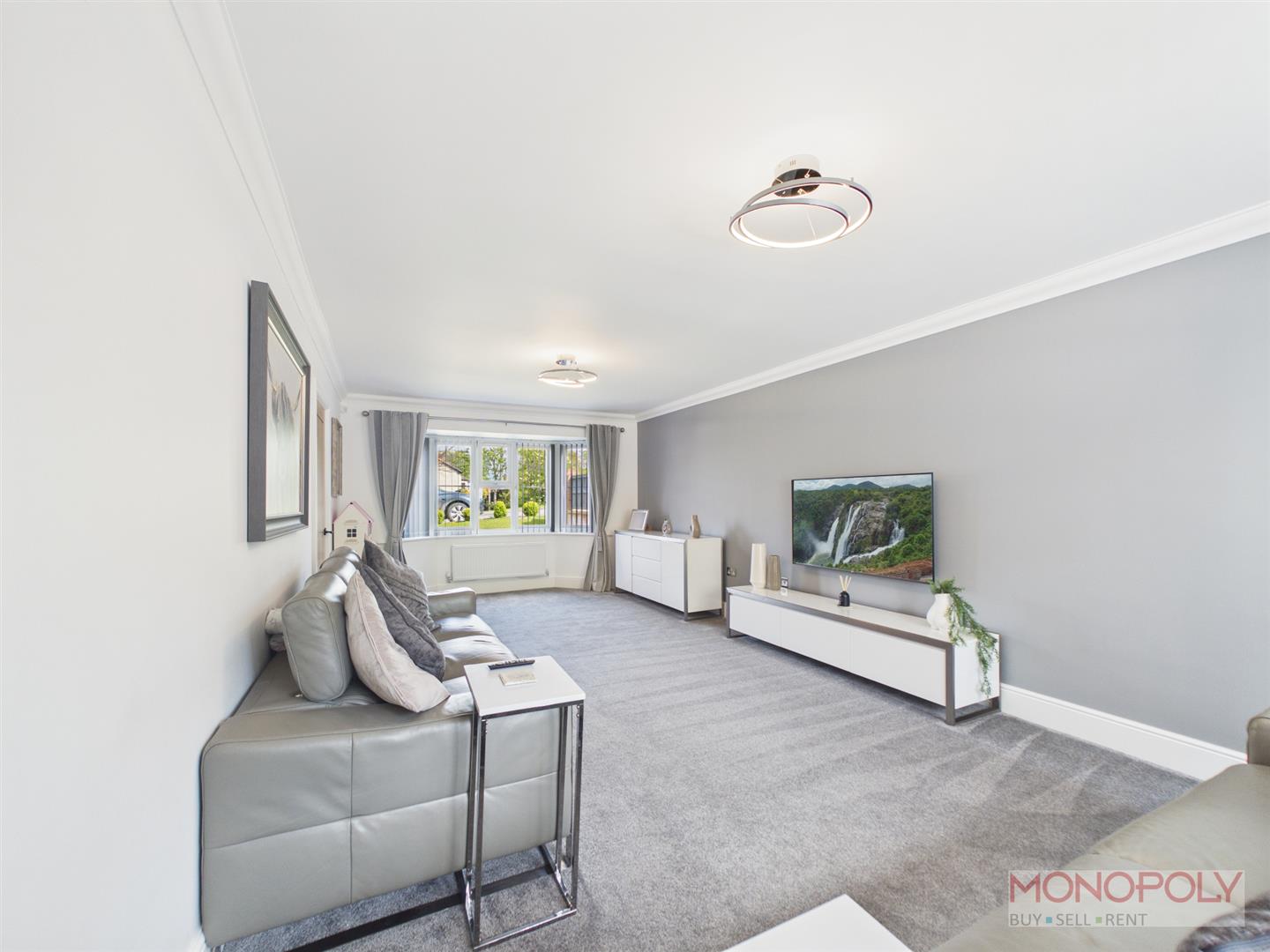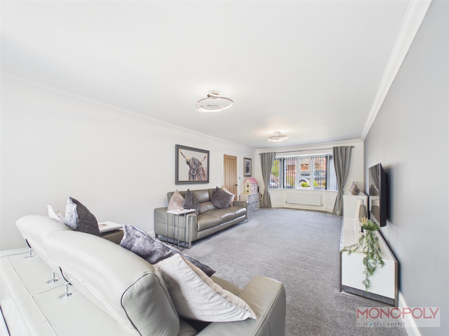 A very generous double aspect lounge with carpet, window to rear, bay window to front and coving.