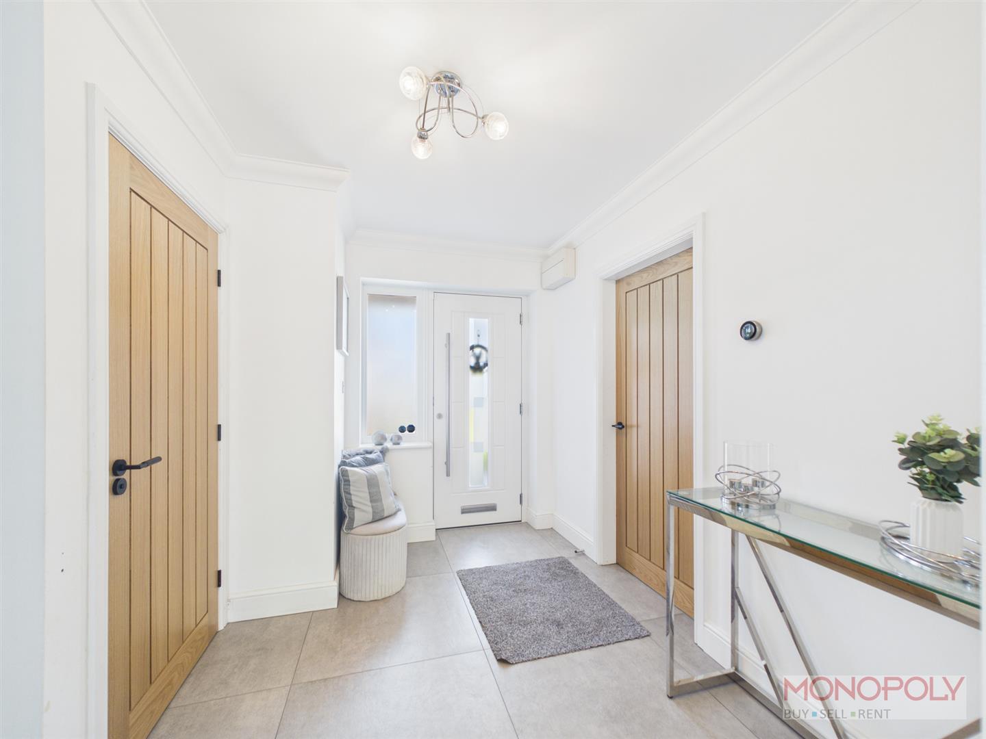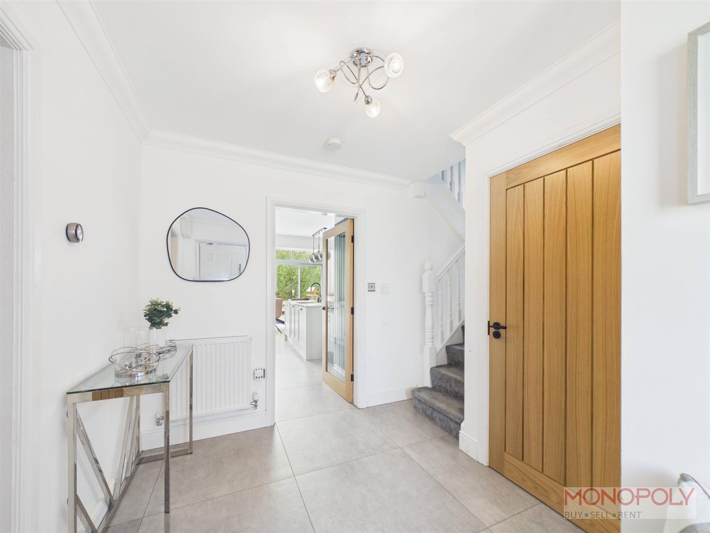 Composite entrance door with glazing to one side, tiled flooring, contemporary oak doors to the living room, downstairs wc and glazed Oak framed door to the kitchen, stairs rising to the first floor.
