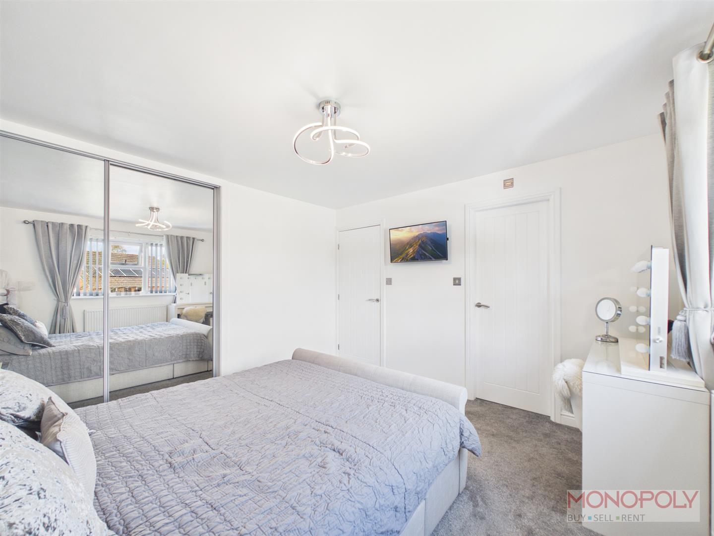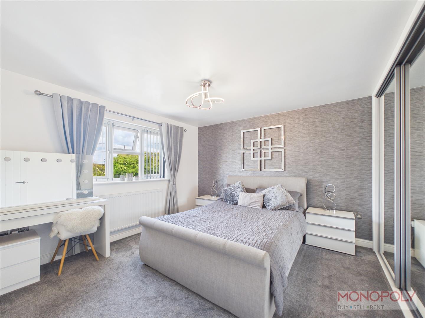 Principal bedroom with carpet, window to front, build in mirrored sliding door wardrobe, door to en suite.