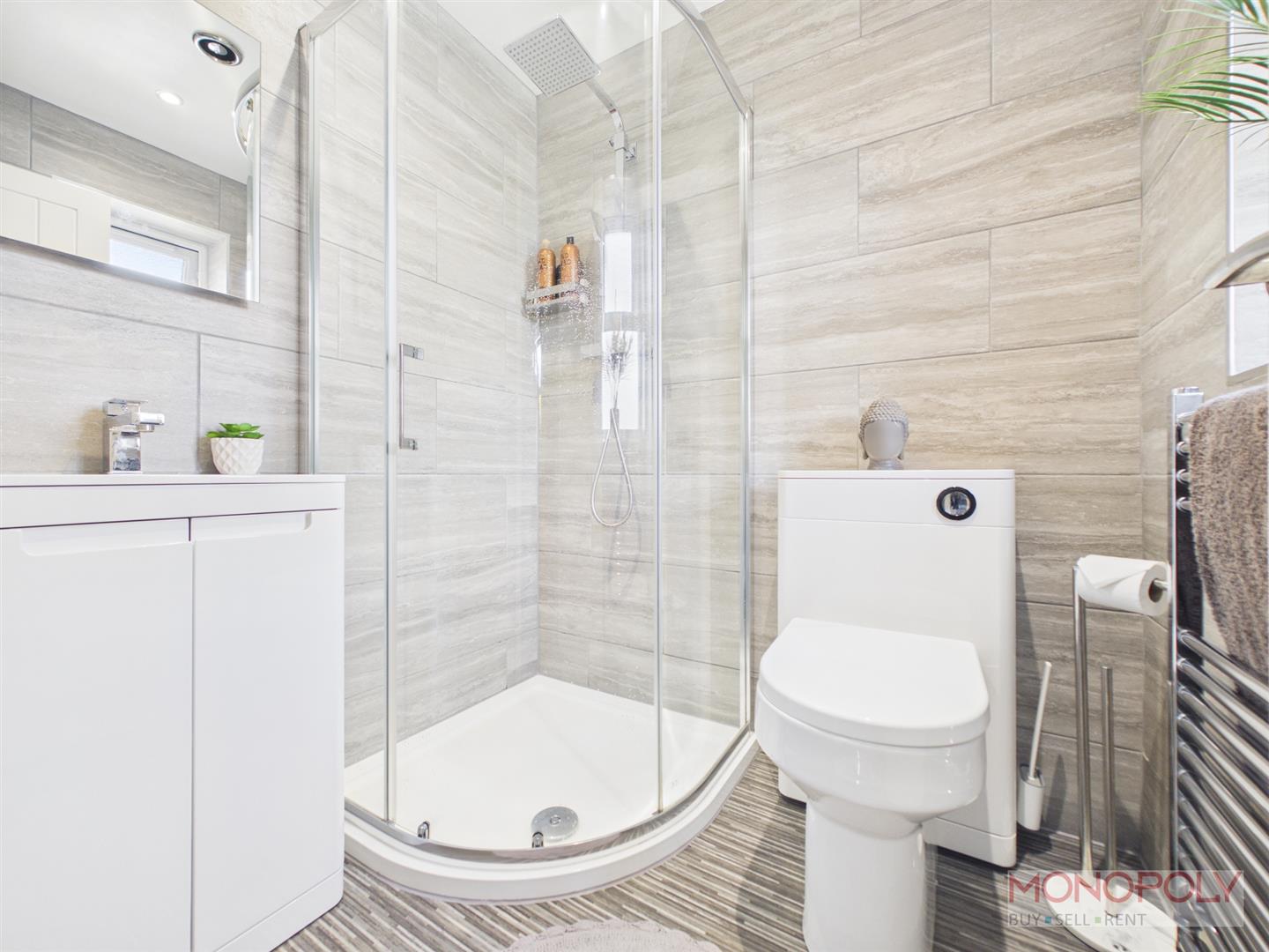 Modern suite comprising a corner shower enclosure, wc, hand wash basin set in a vanity unit, frosted window to front, chrome towel radiator, tiled walls and floor, wall mounted mirrored bathroom cupboard, extractor, spotlights.