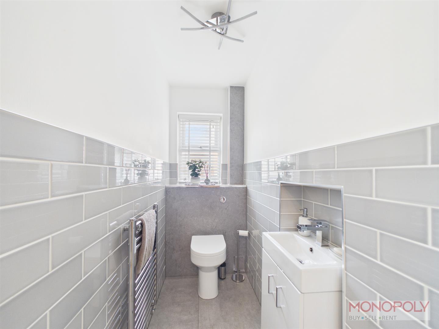 Low level WC, hand wash basin set in vanity, chrome towel rail, tiled splashback, window to side.