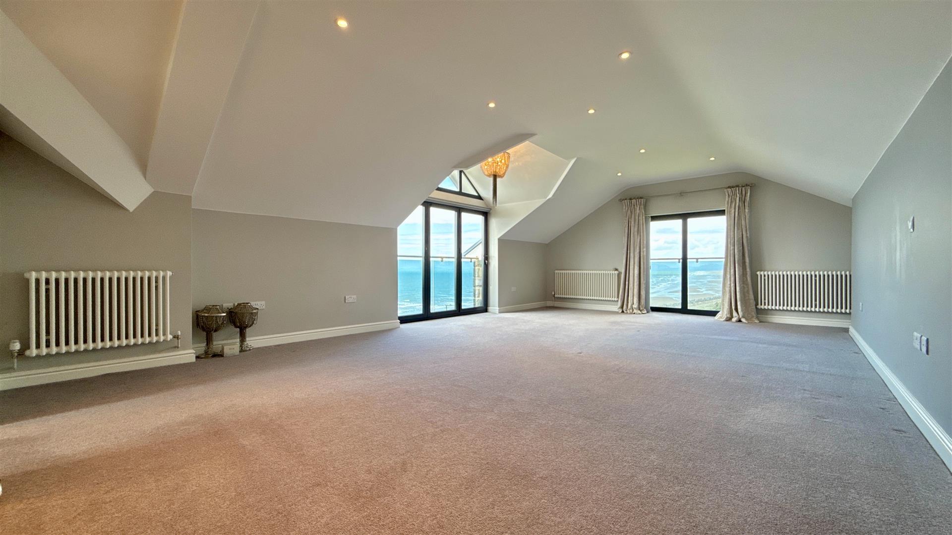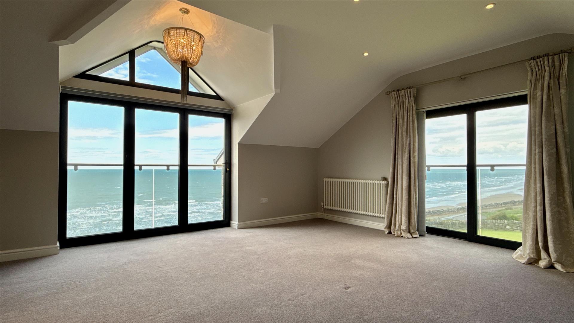 Boasting three bedrooms; the principal bedroom suite is remarkable and spans the entire first floor including dual aspect Juliette balconies with both sliding and bi-fold doors which maximise the spectacular views, bring in the sound of the waves, and allow the fresh coastal air to drift through. In addition there is a well appointed en-suite with both free standing bath and large shower, plus a large dressing room.
