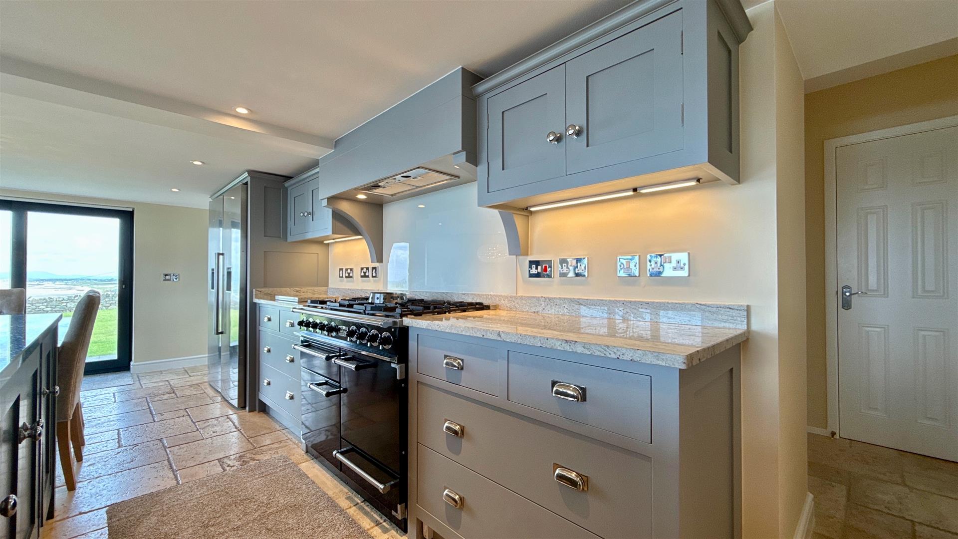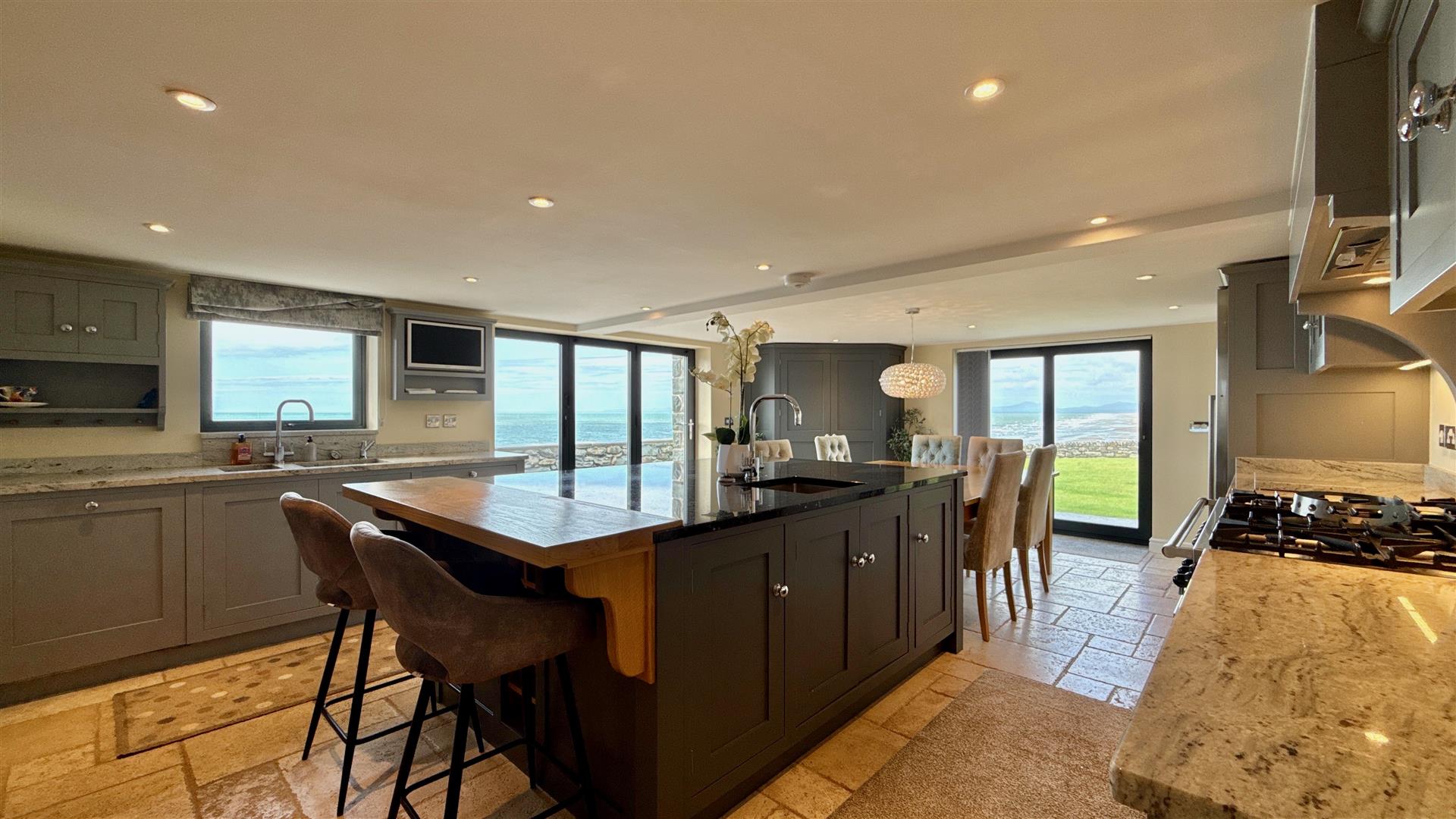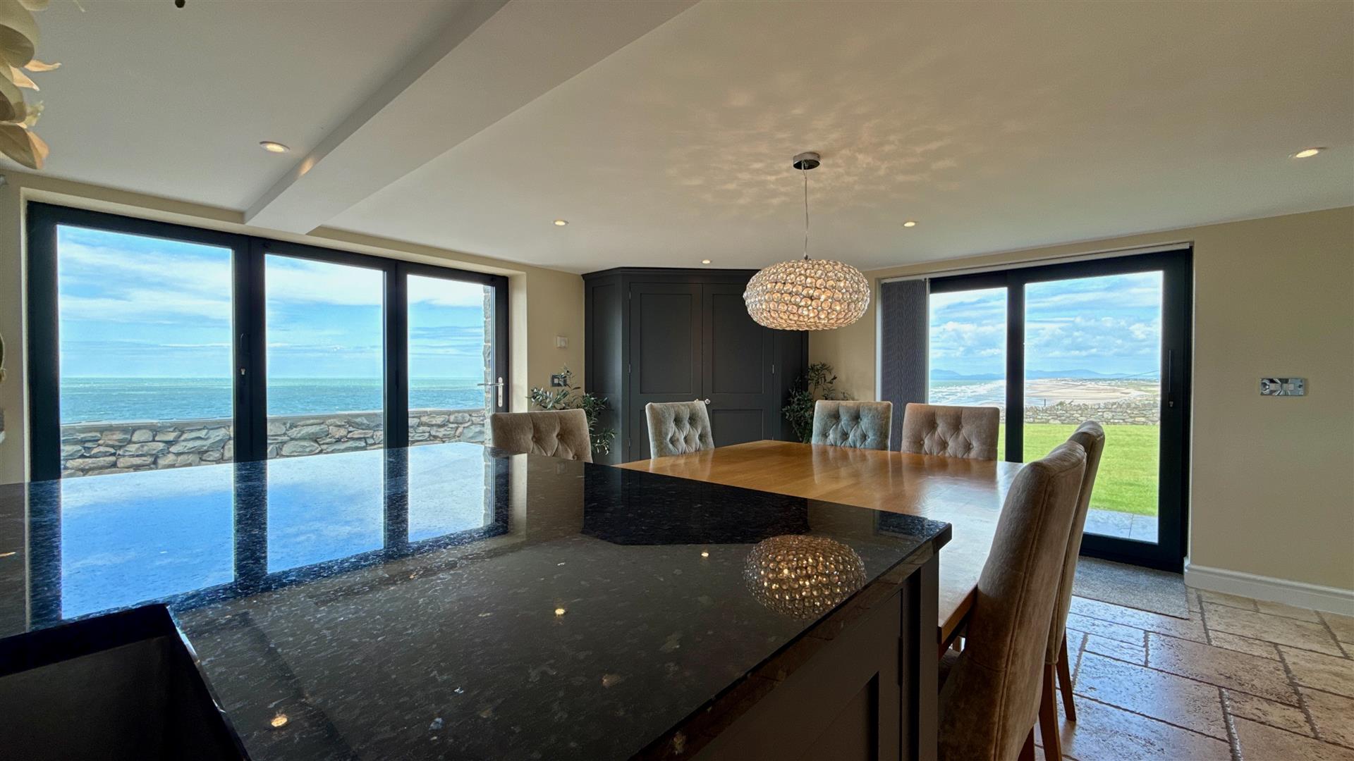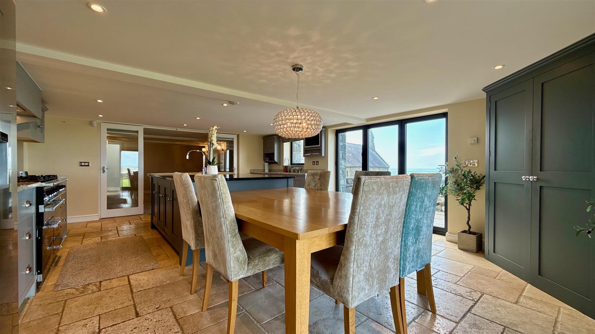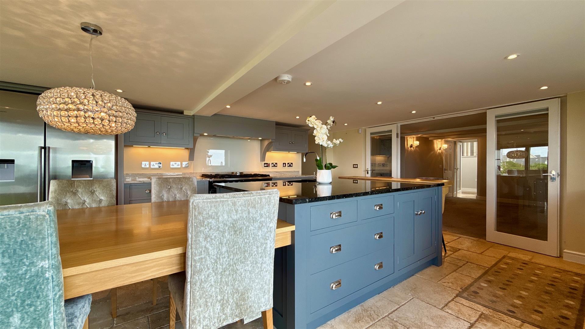 The kitchen/diner is the piece de resistance with a sea of granite worktops and island, bespoke units and high end appliances. Open plan to the dining area, patio doors to the front and bi-folding doors to the side seamlessly connect the outside and in and allow full appreciation of the immense sweep of the bay and the incredible location.
