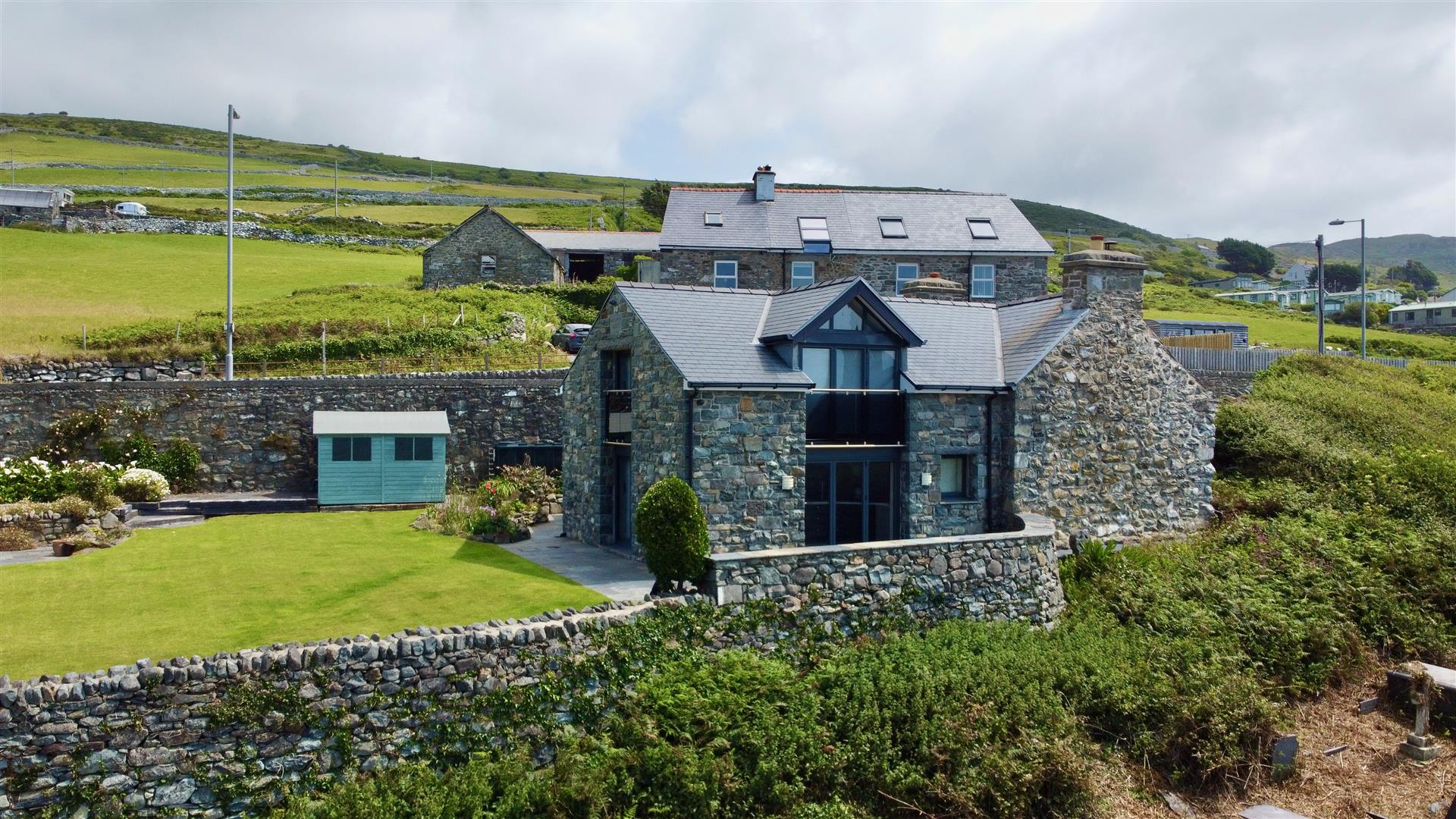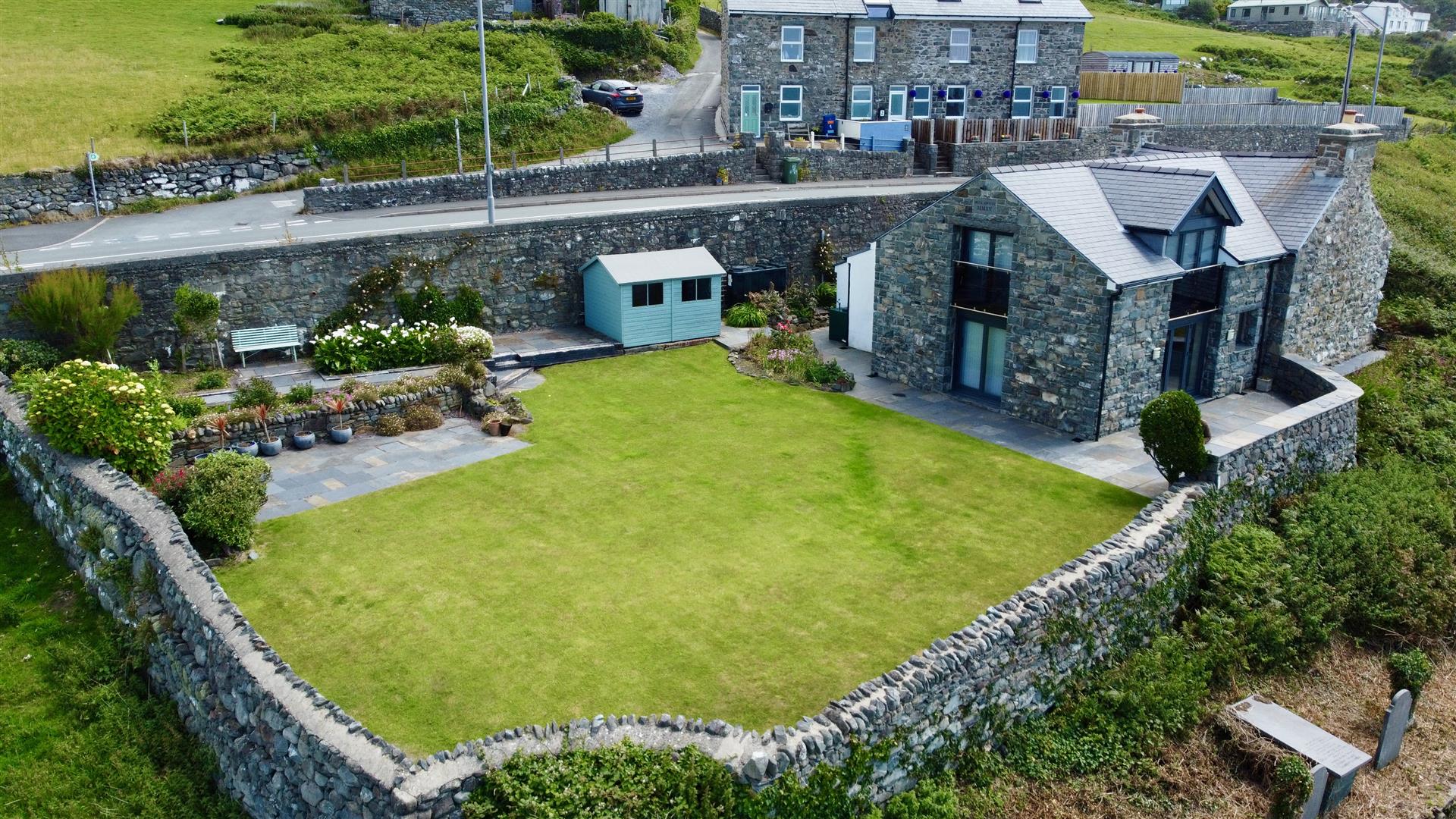 The coastal facing gardens are beautifully landscaped with lawns, slate patios and a large shed, all bound by stone walling and there is a driveway parking to the front.
