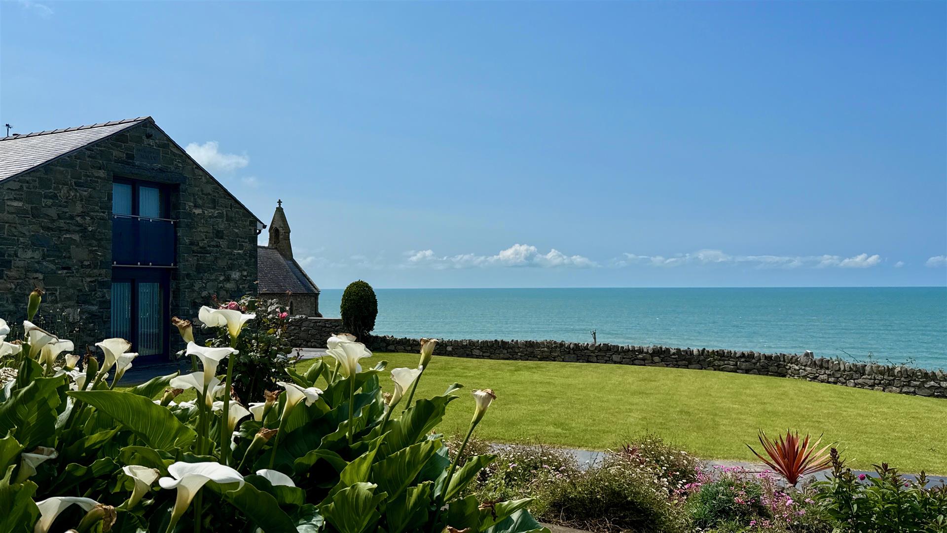 The beautifully landscaped gardens face the coast and border on to the field at the side. They are bound by stone walling and laid to lawn with numerous slate patio areas. To the front there is driveway parking and steps lead to a further patio and the entrance porch.