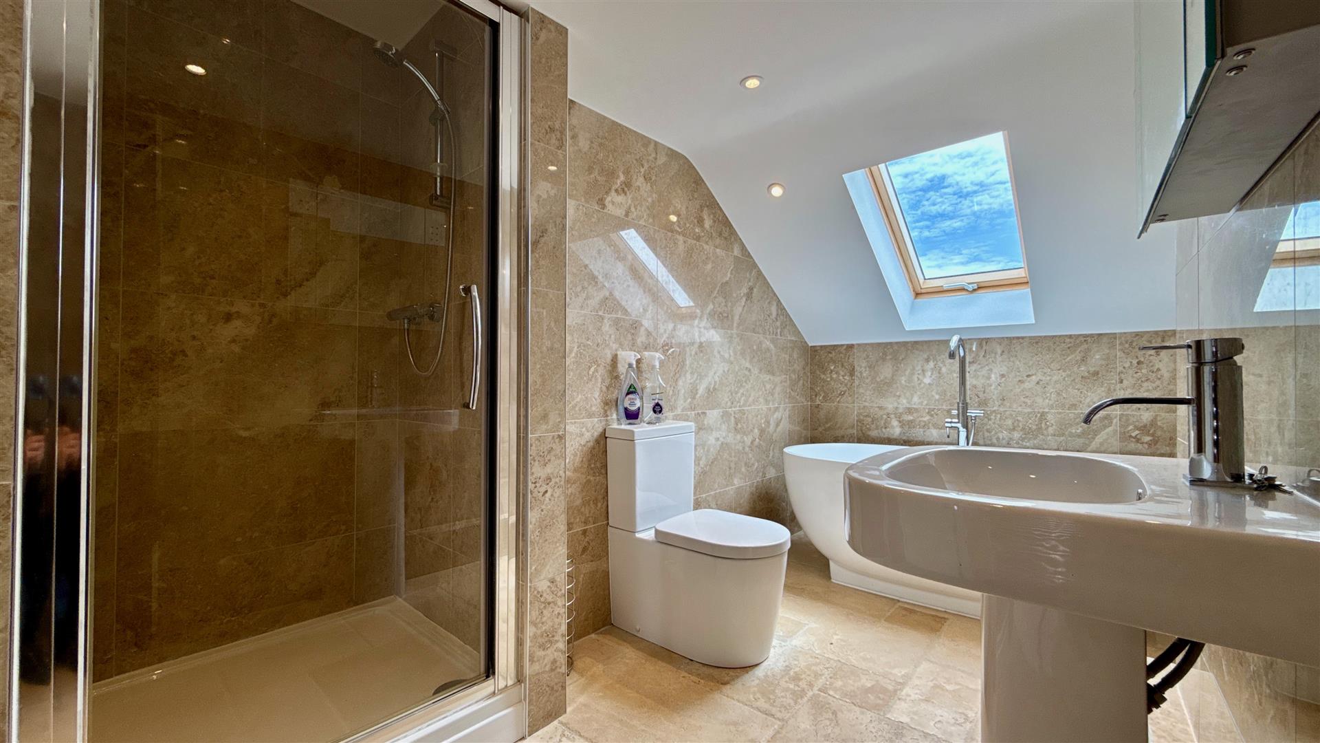Best described as luxurious with a large free standing bath, separate large shower cubicle, hand basin and low level WC. Fully tiled with roof light window and recessed spotlights.