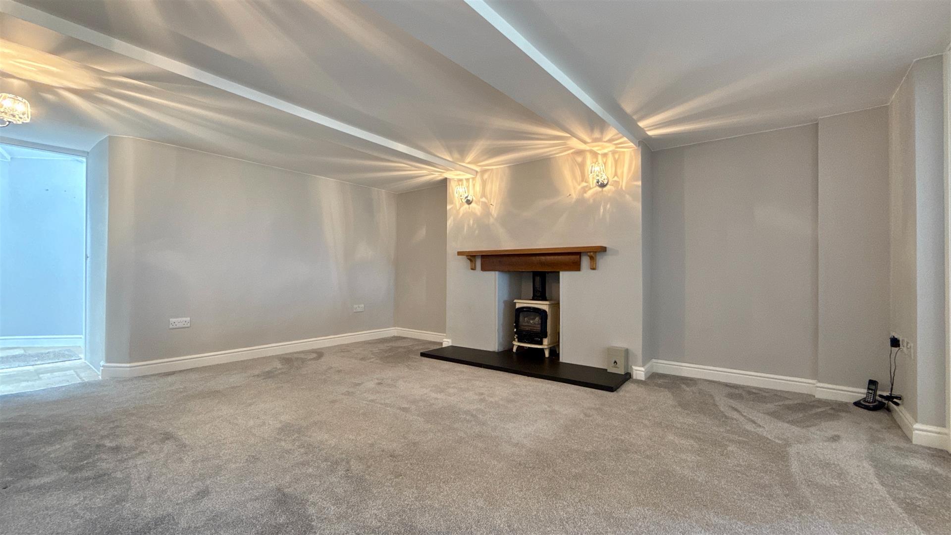 A very cosy room with enamel Stanley log burner on slate hearth with wooden mantle, white painted beamed ceiling and large store cupboard. Double doors open to the kitchen/diner.