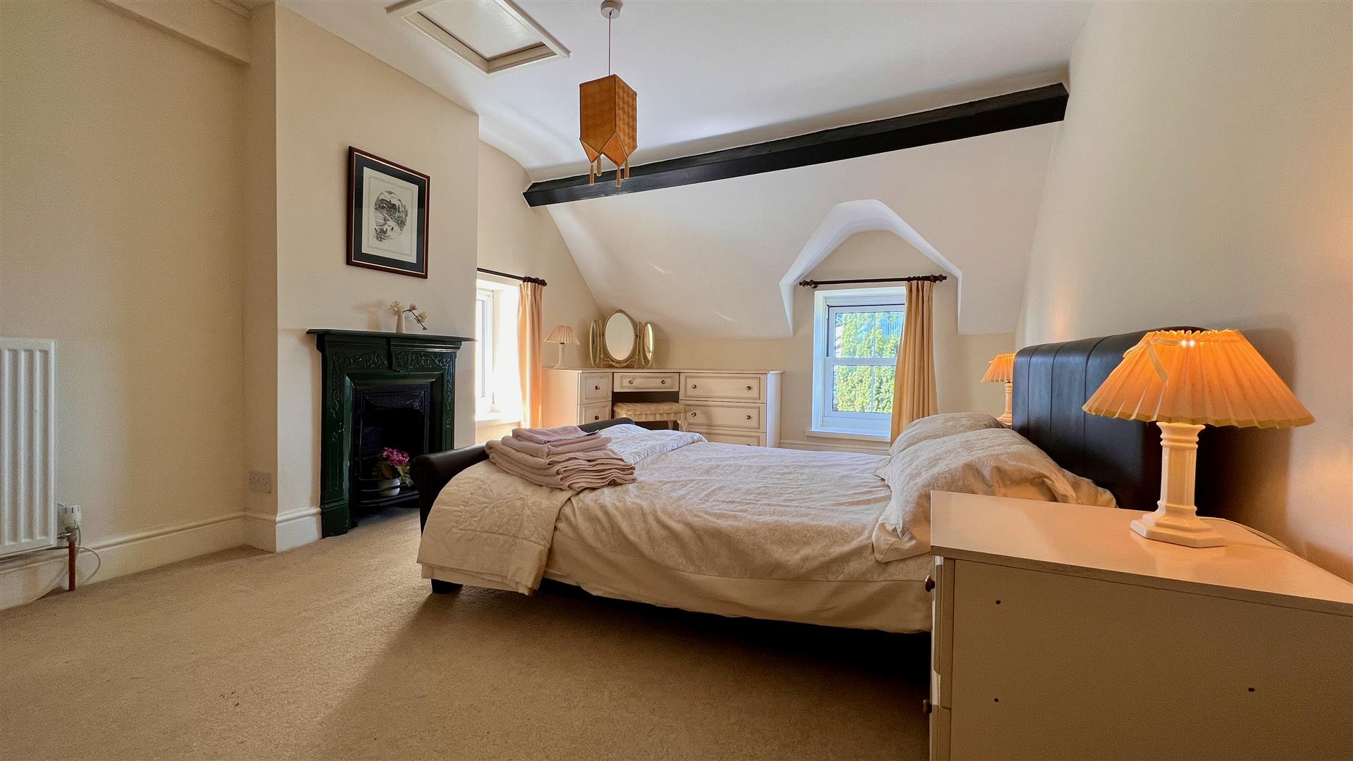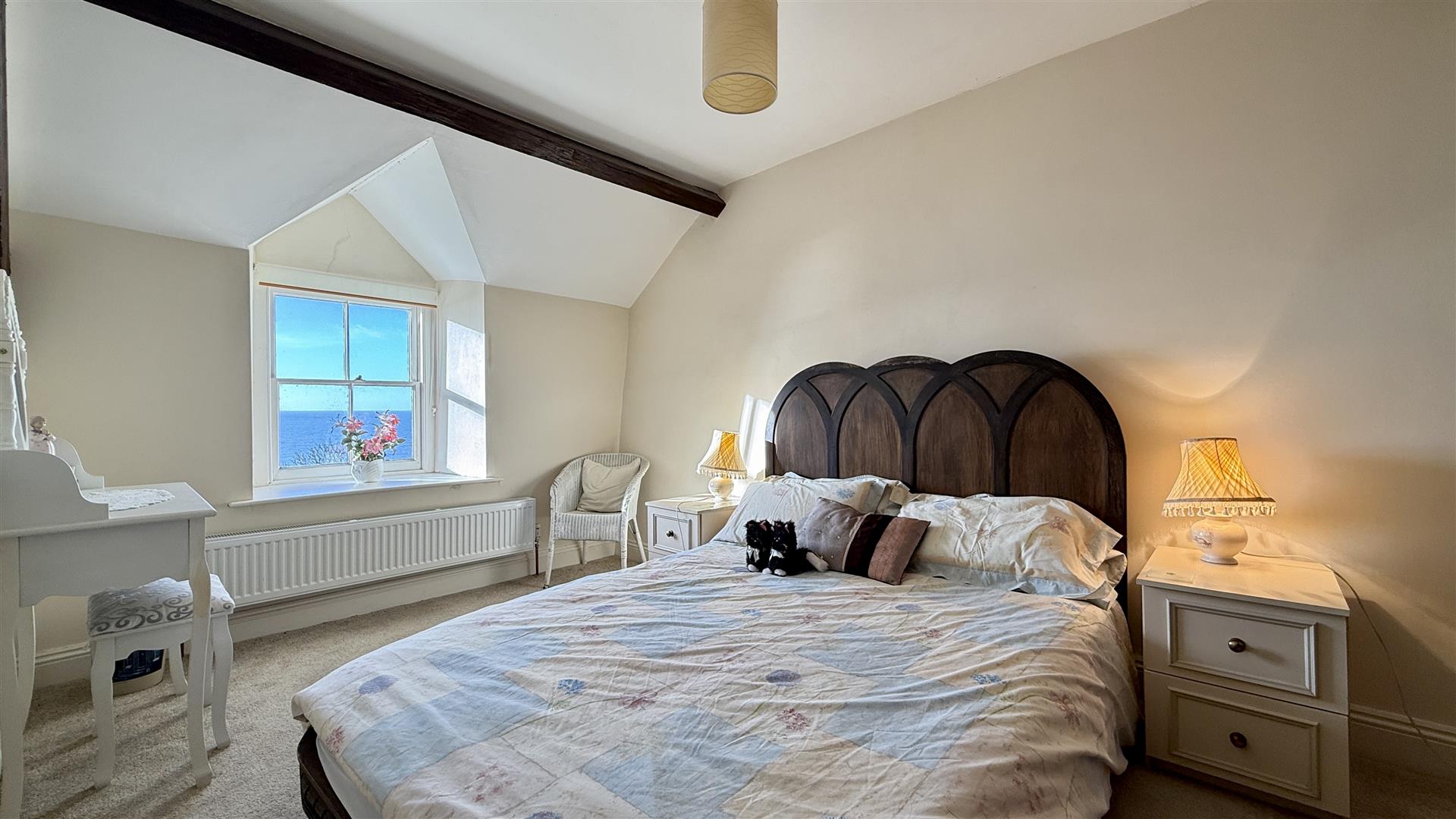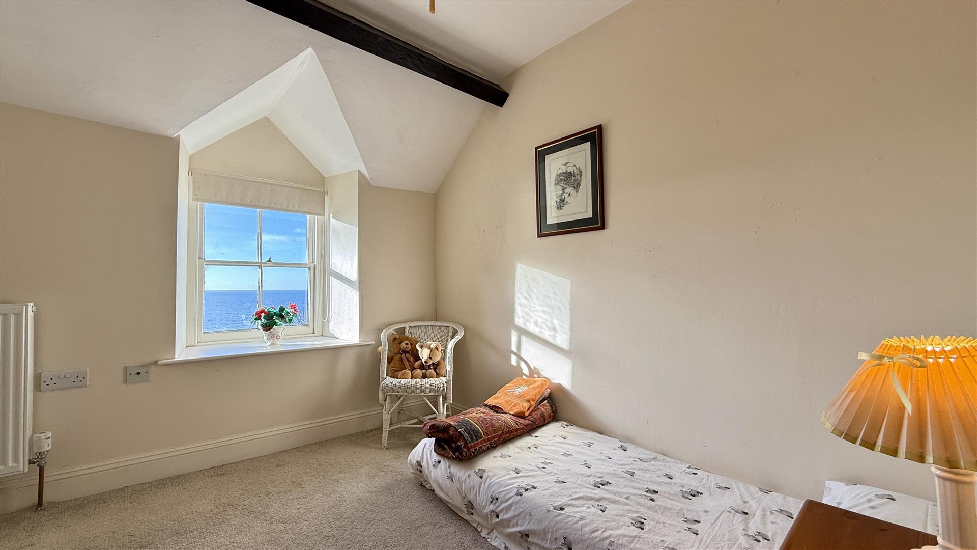 The principal bedroom has en-suite bathroom, dressing room, private staircase and vaulted beamed ceiling, there is a second bedroom with dressing room and en-suite. A third bedroom is a spacious double bedroom with feature Victorian fireplace and also a private staircase. This bedroom benefits from a large en-suite with both a spa bath and a separate large shower. The remaining 2 further bedrooms have lovely sea views the front and share a shower room with a steam spa shower unit.