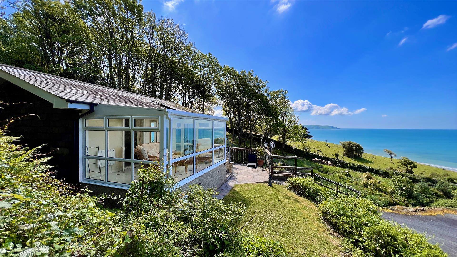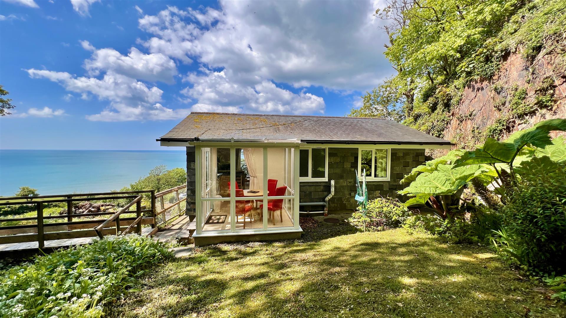 A detached bungalow with woodland gardens and a stream running close by. This delightful property has been recently refurbished and comprises of two double bedrooms and a large open plan lounge/kitchen. There is a family bathroom and not only a conservatory to the front but also a sun room to the rear. There are gardens to front and rear and a large balcony and patio from which to enjoy the spectacular coastal views. There is even a little bridge which crosses the stream to a woodland path and bluebell wood. The bungalow has full planning permission as a holiday let property and as such is exempt from second home council tax levies and also meets the annual requirement of 182 nights bookings. The majority of contents and furnishings can be included on the sale.