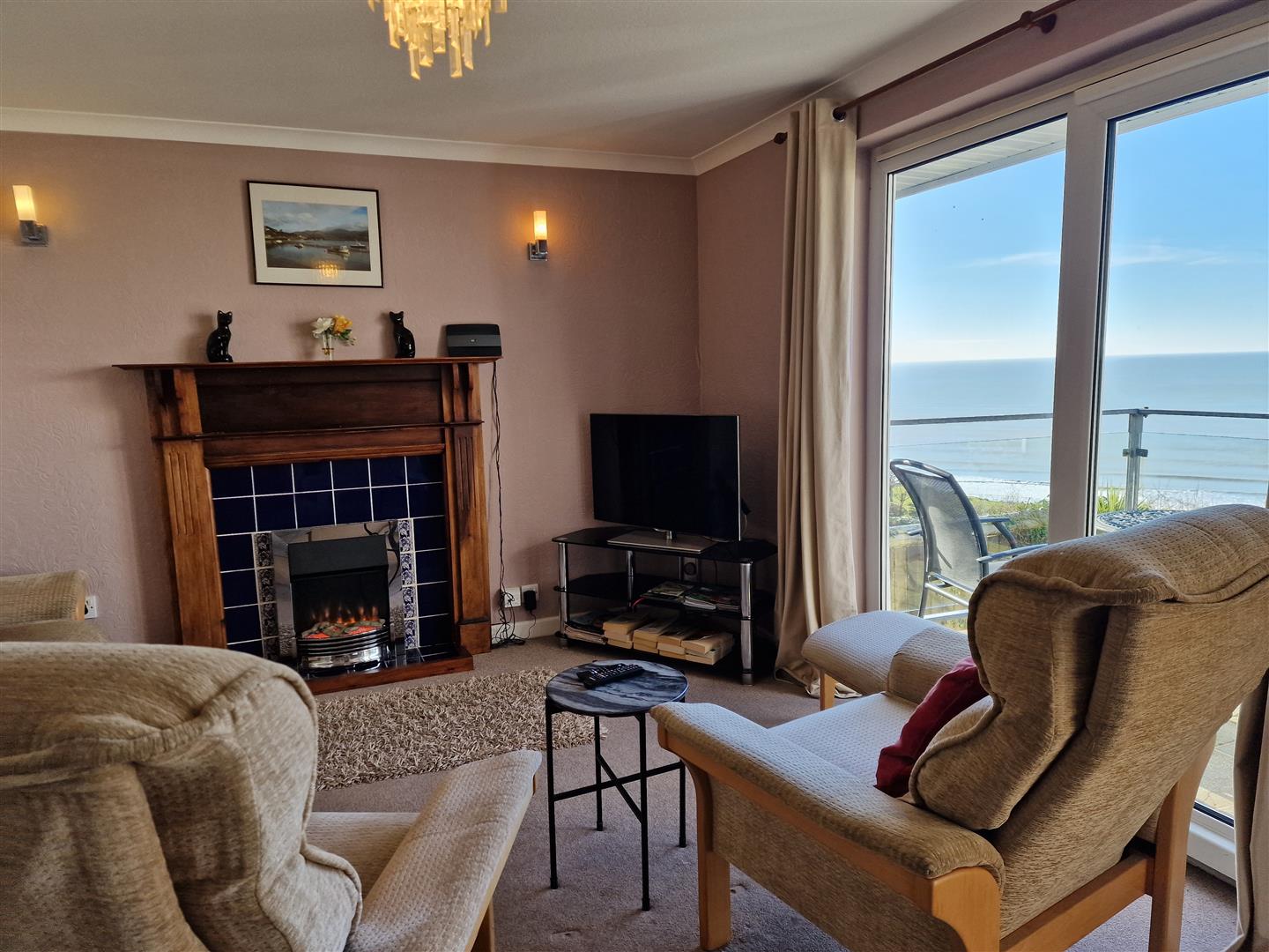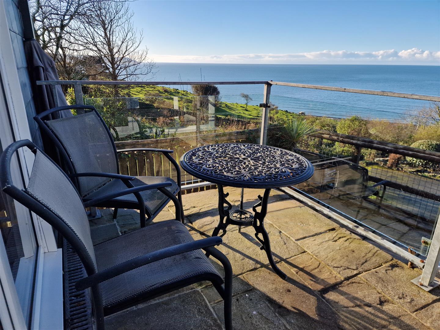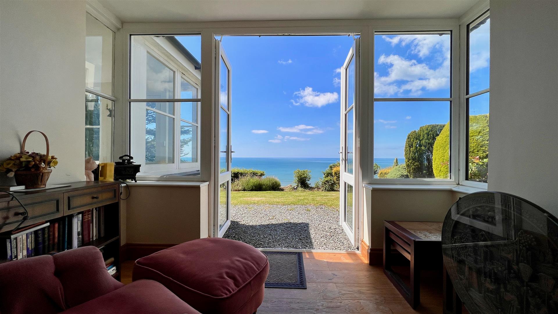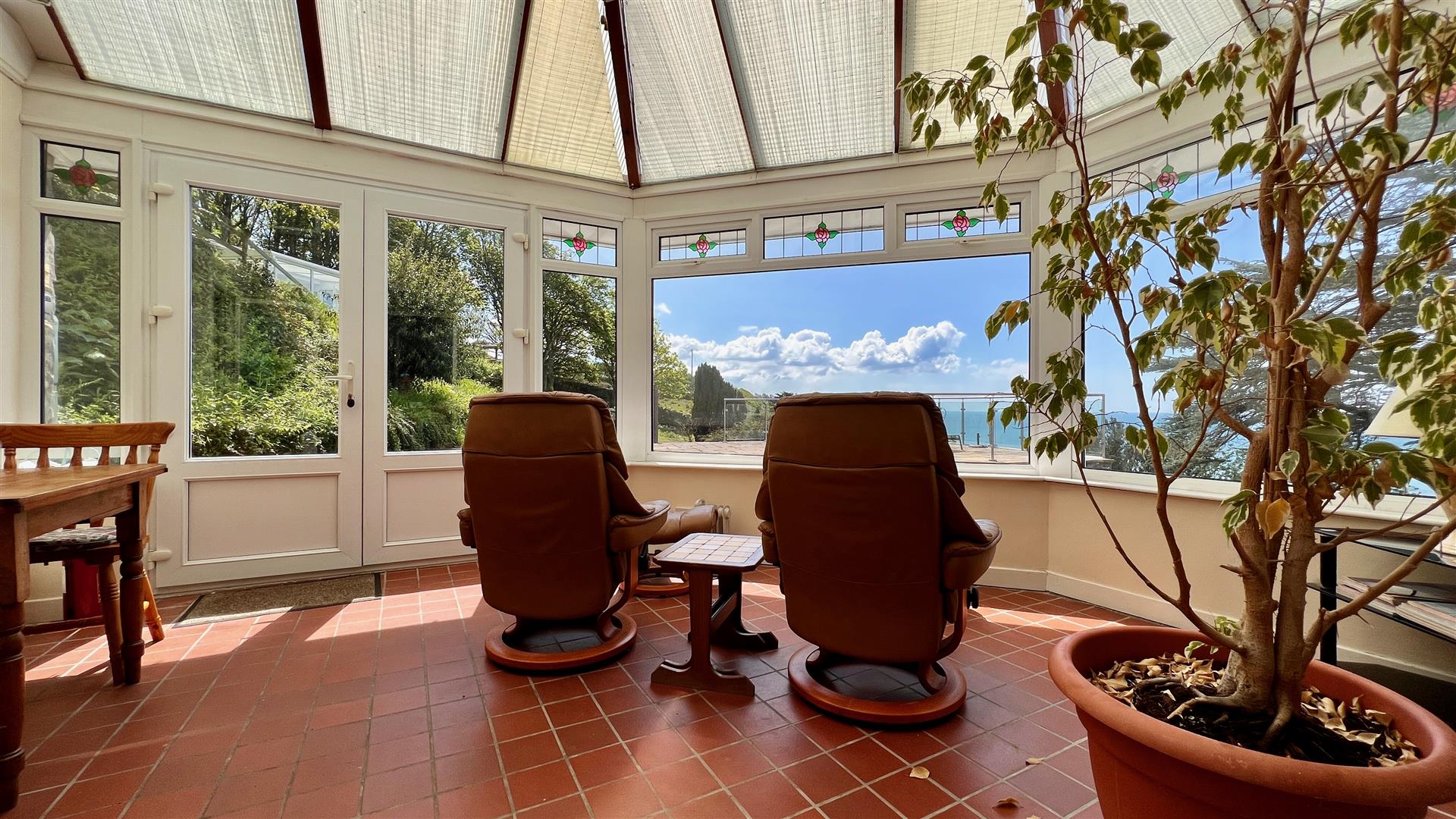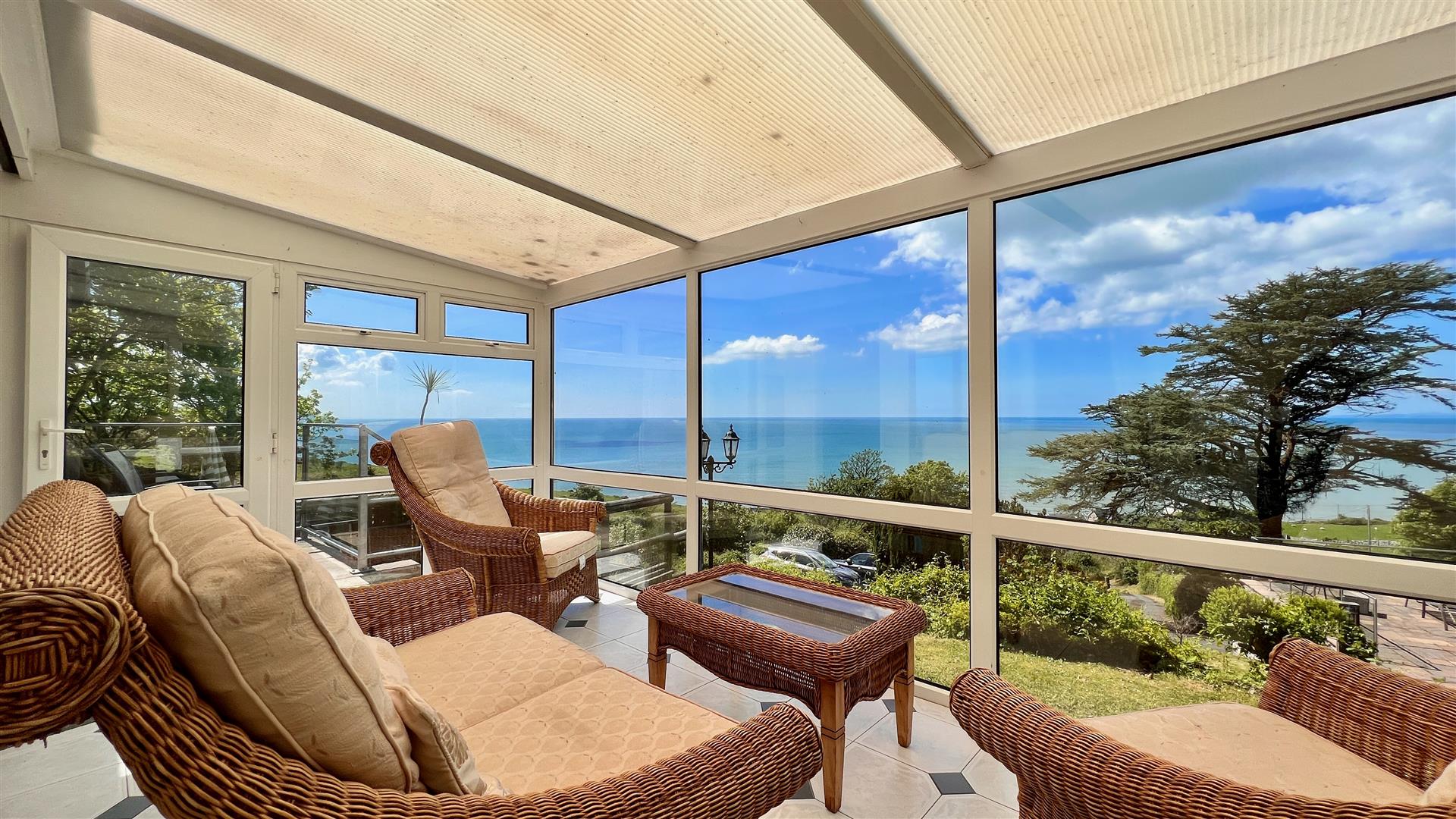 A further sitting room has the potential to be an ideal cinema or games room. Door leads into a large conservatory which opens out to the large sun terrace with glass and glazed balcony with panoramic views overlooking the coast. Ample space for a hot tub, outdoor kitchen, barbecue area or even a pool.