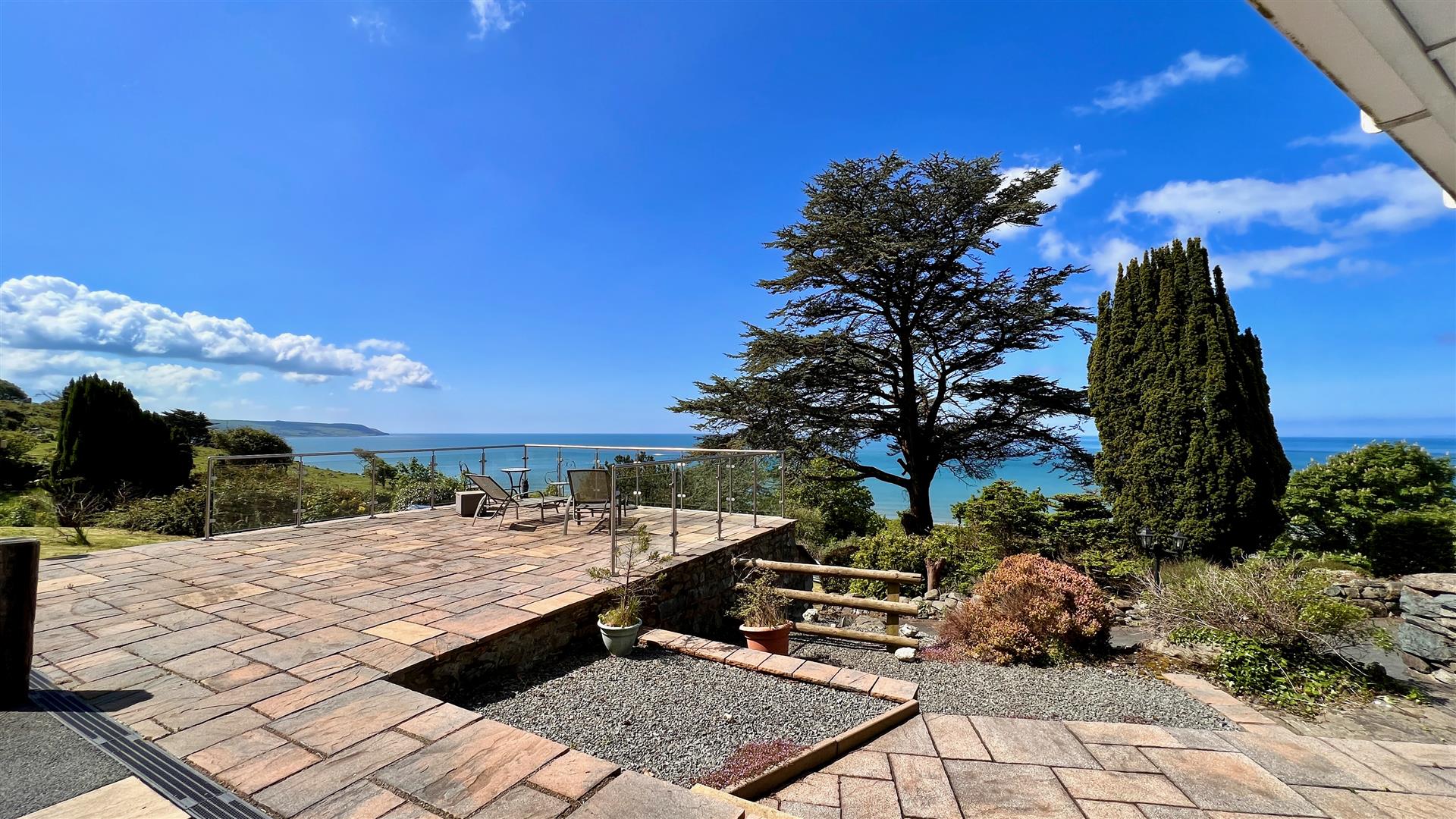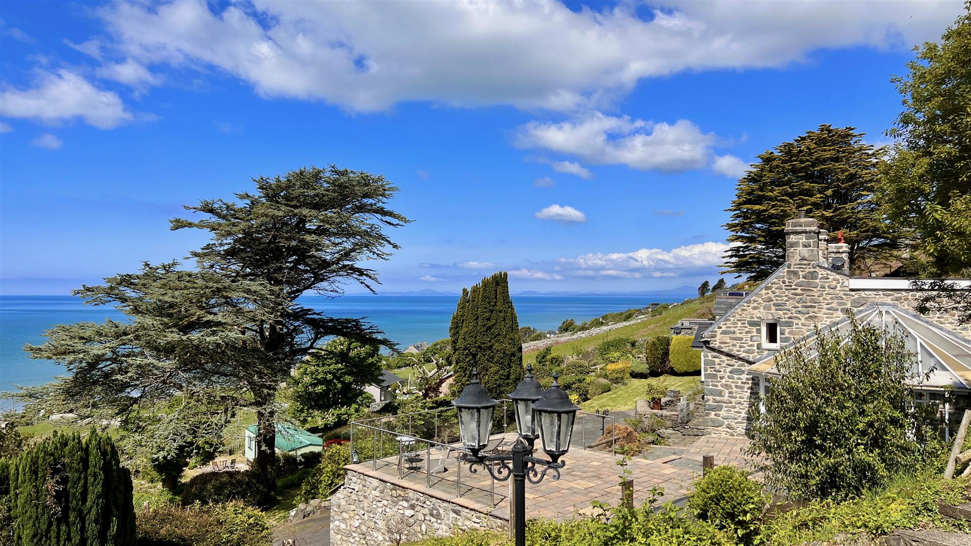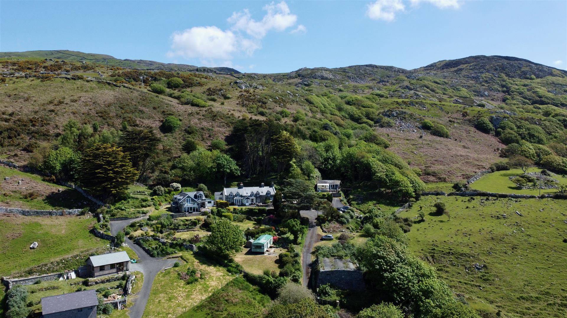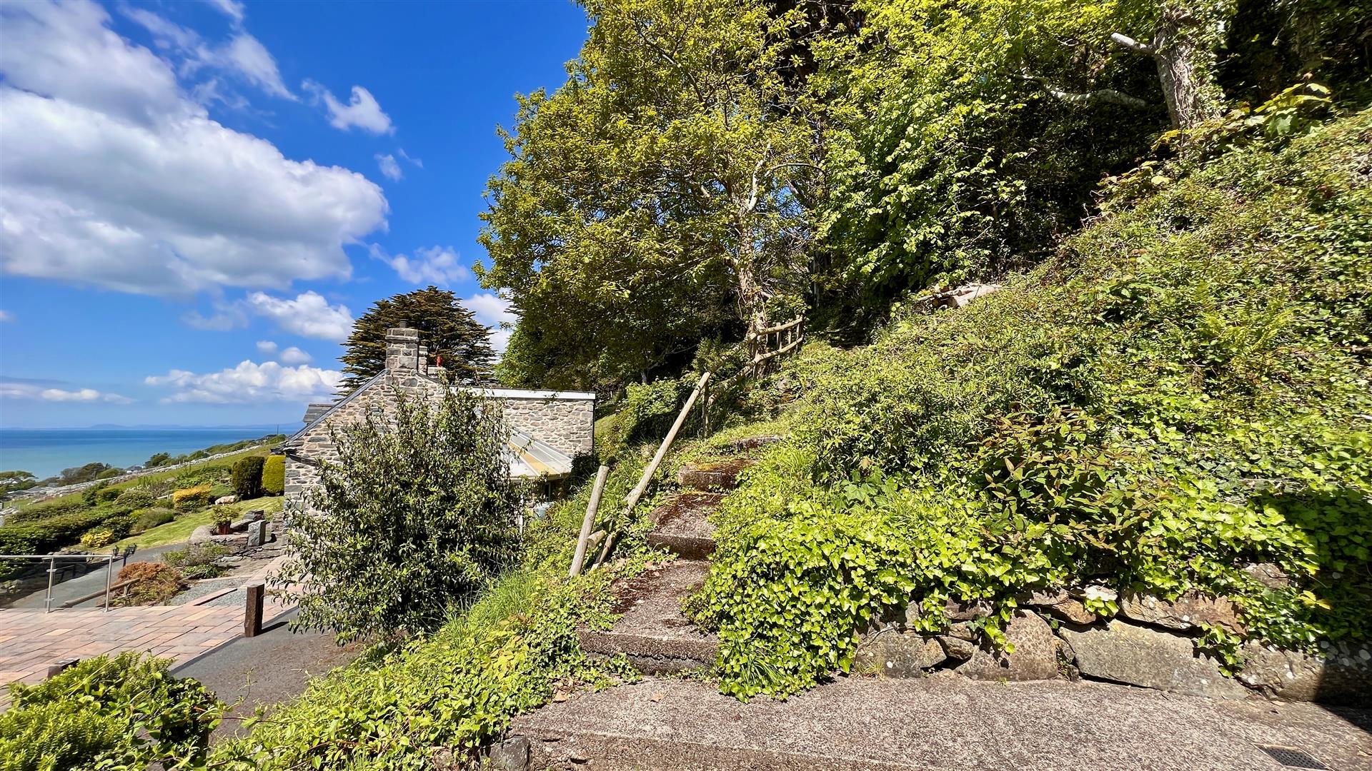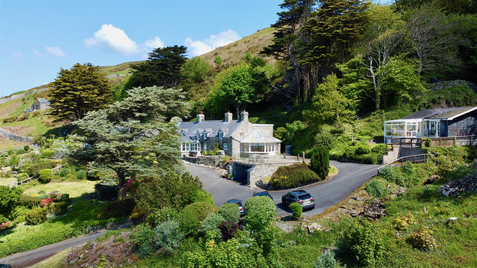 The grounds are beautiful with landscaped terraces, woodland and a cascading stream. The property is sheltered in the lee of the hillside facing the coast and consequently in a light and sunny position with spectacular panoramic views across Cardigan bay and positioned to enjoy spectacular sunsets. There are lawns, flower beds, mature bushes and shrubs and a bluebell wood. There is a fig tree and an apple tree and a space for a vegetable garden. The cascading stream leads down to a pond. Subject to planning, the area adjacent to the pond would make a lovely spot for mobile sauna complemented by quick dip in the fresh water mountain pond. All the accommodation benefits from private seating areas, there are terraces, patios and balconies galore. A long private road with roadside lawn (shared short section from main road with owner's cottage) leads up to the property where there is an abundance of parking plus the garage. There is ample room to create a private entrance road for the property by utilising the roadside lawn (with permission)