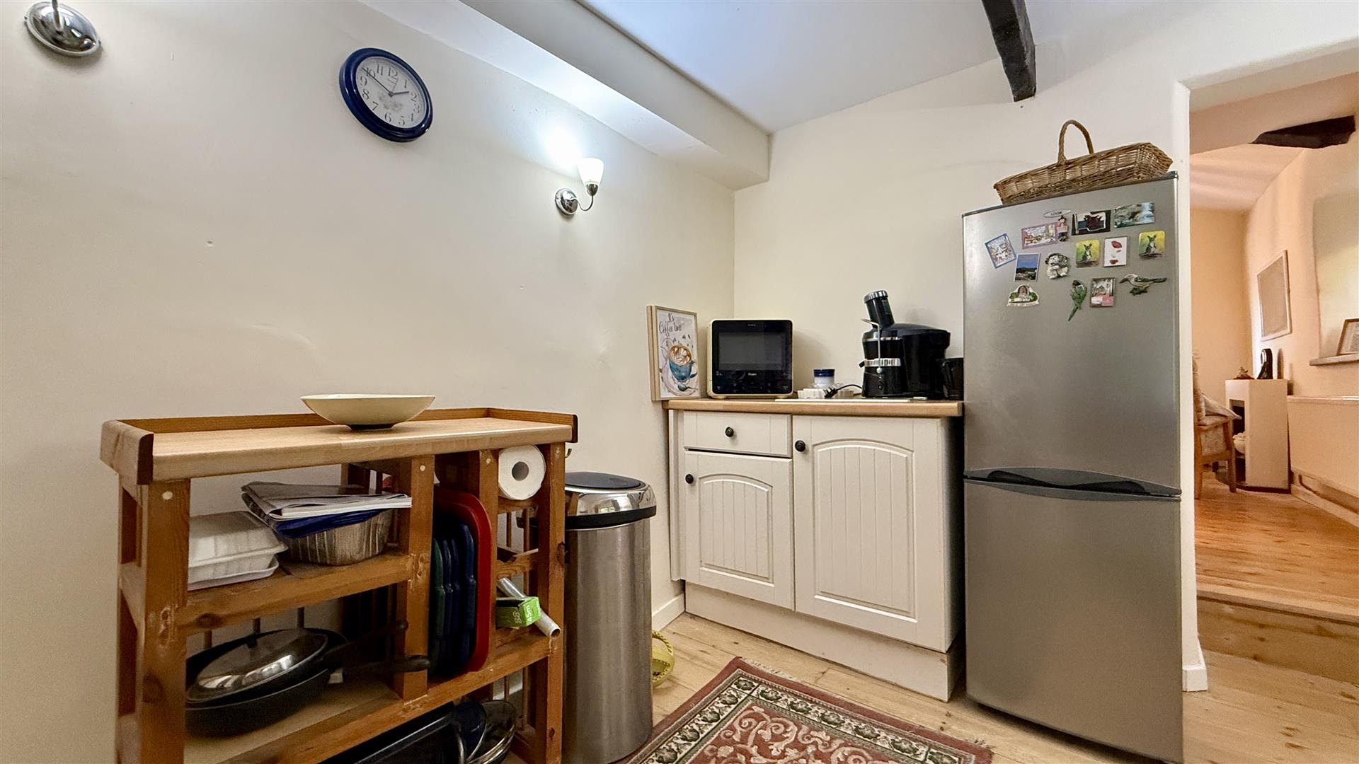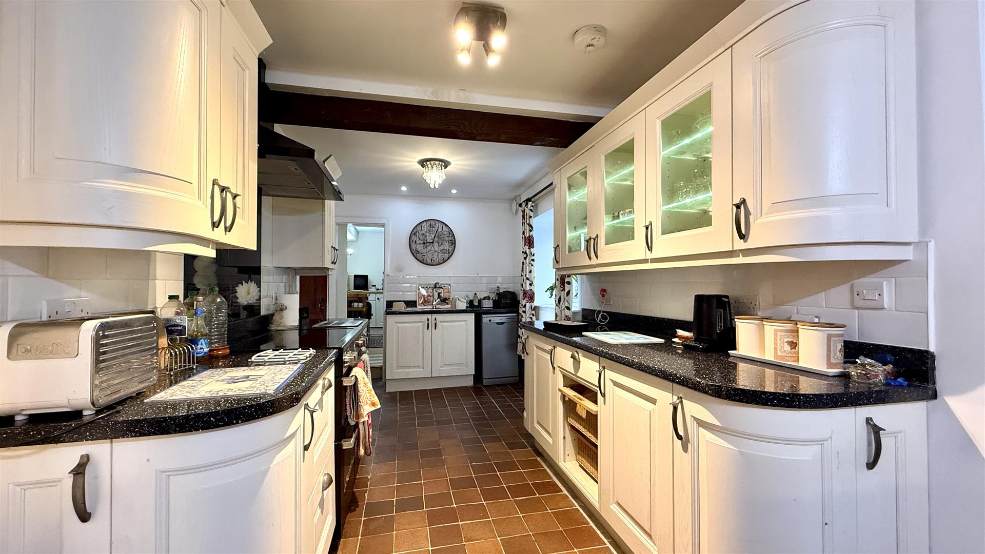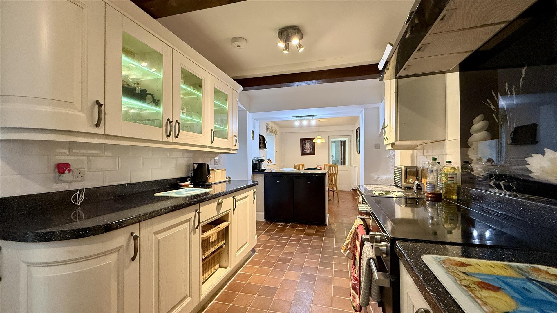 The large kitchen with dining area has been recently extended and is well equipped with a range of wall and base units plus peninsular island with seating. The appliances include an under counter fridge freezer, and space for a dishwasher and large induction range style cooker. Adjacent is the laundry utility and WC. A further large utility area, off the kitchen offers extra pantry space.