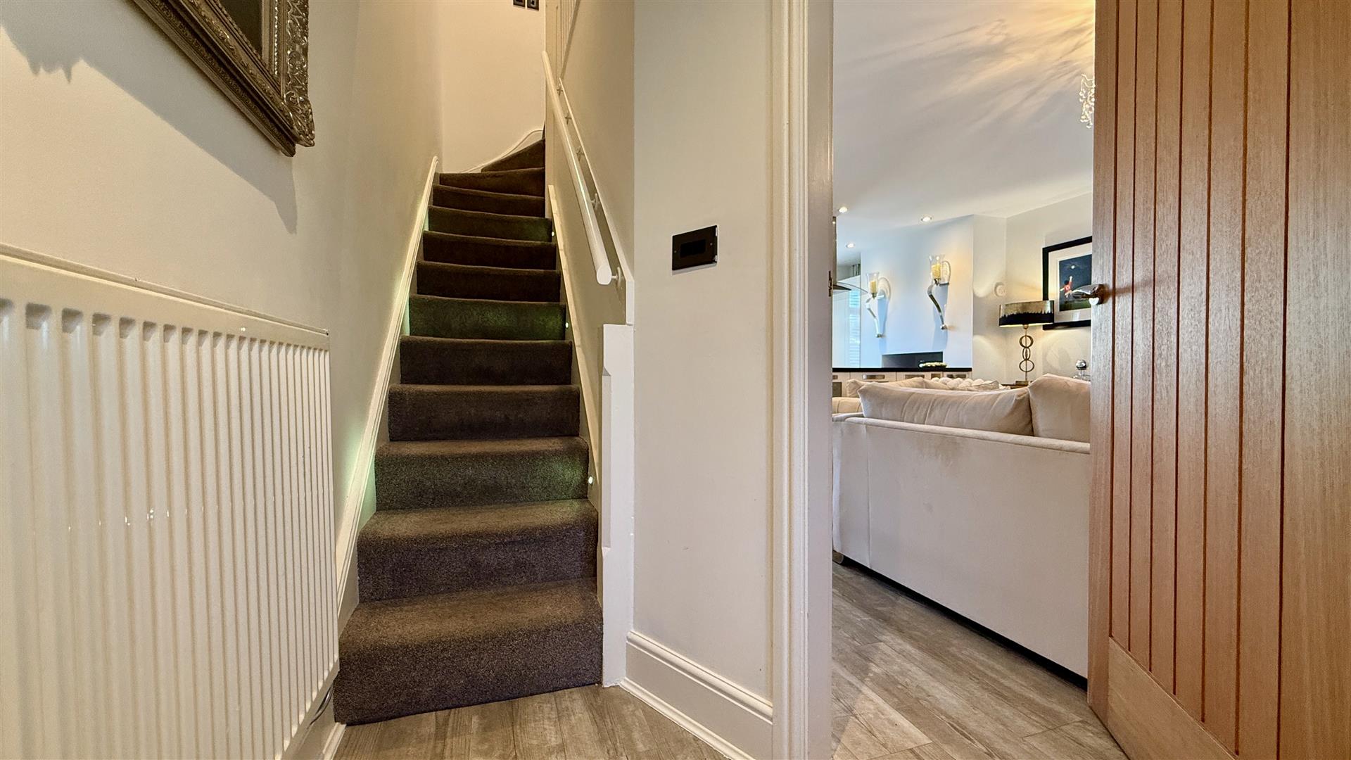 With wood effect laminate flooring, space for coats and boots, door to open plan lounge/kitchen/diner. Carpeted stairs with LED stair lights and wooden banister lead up to the first floor.