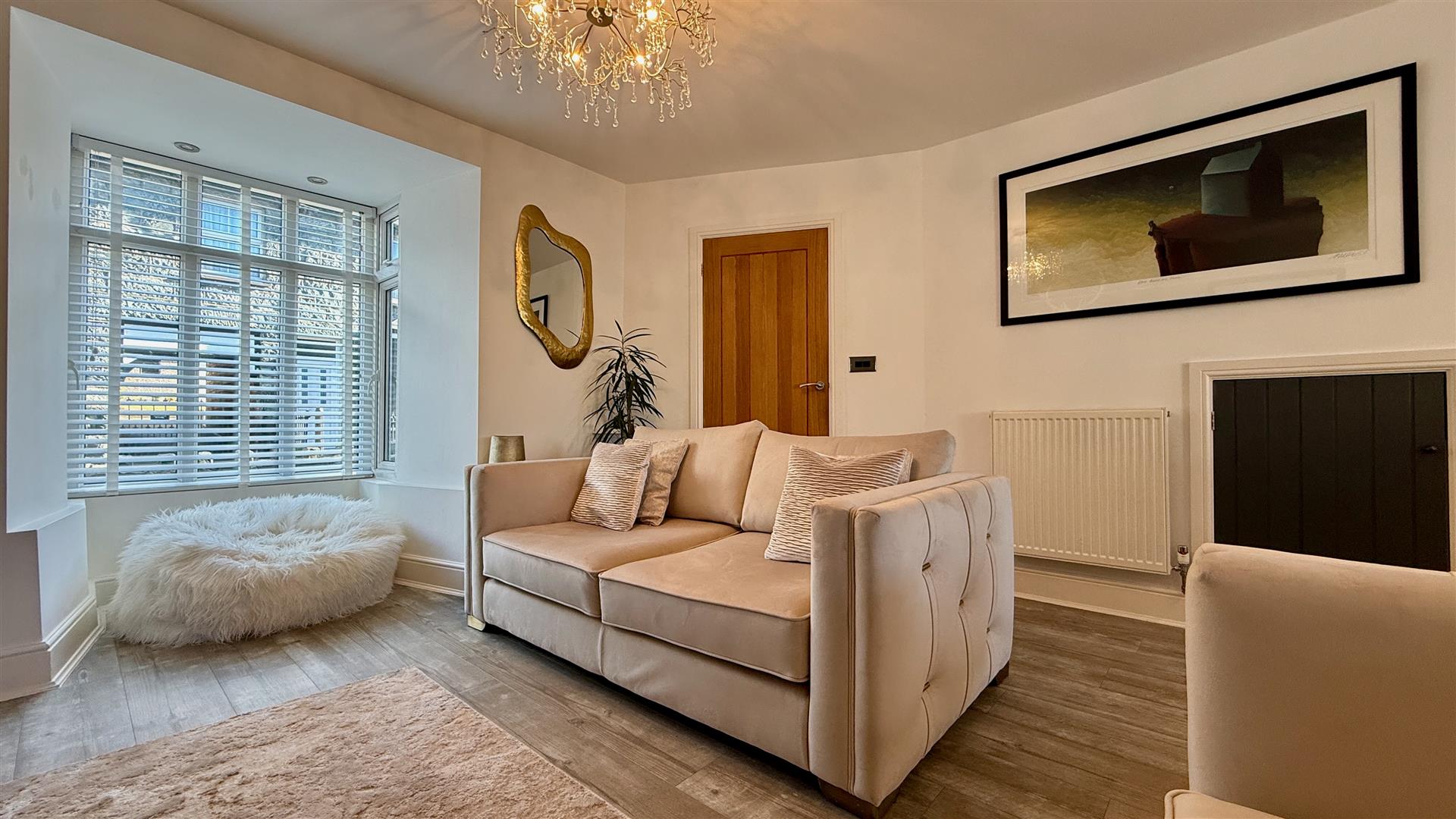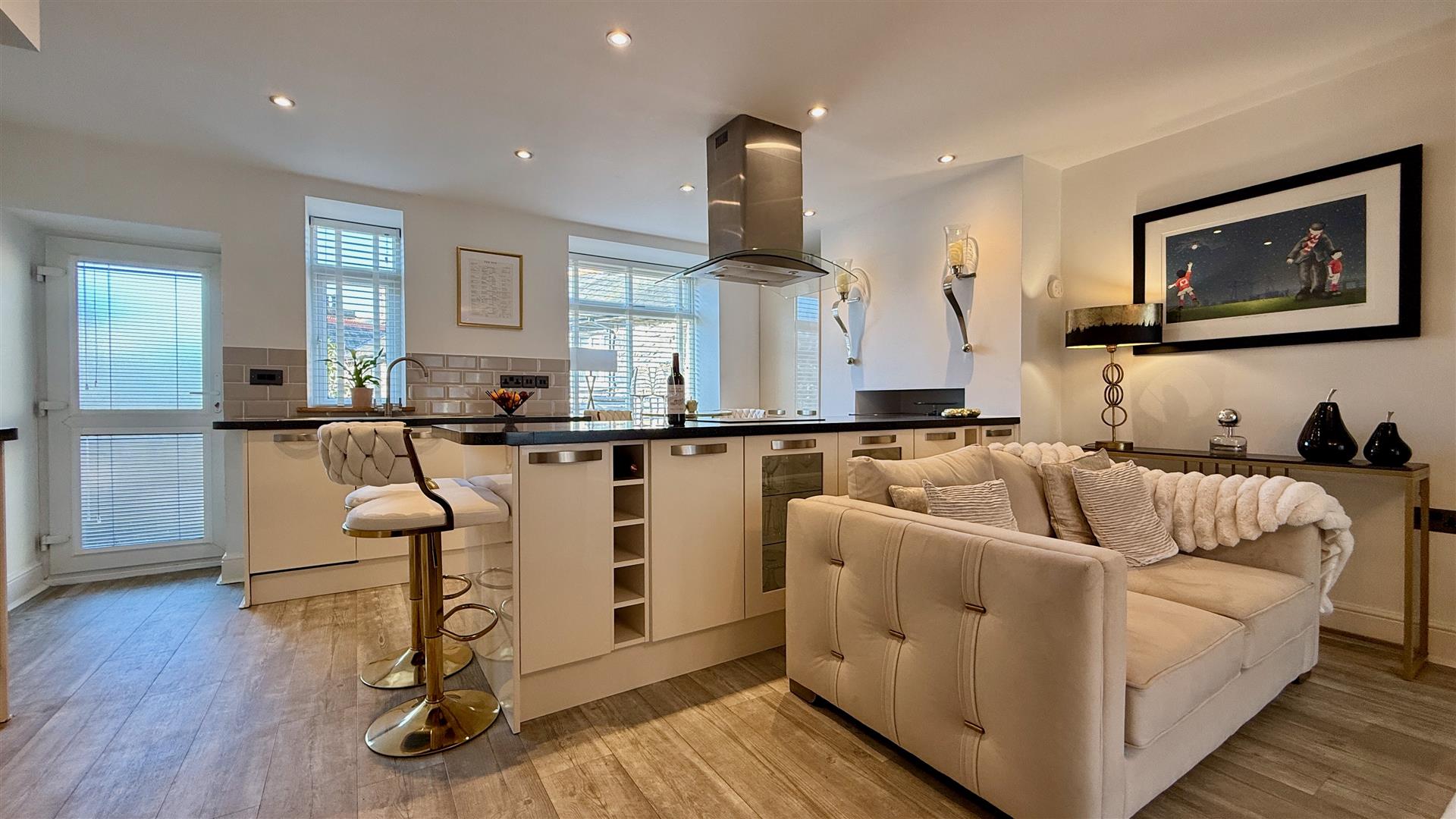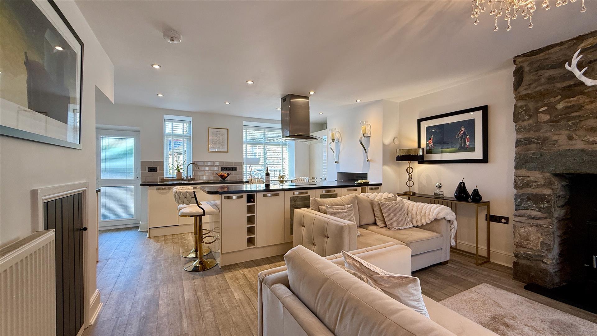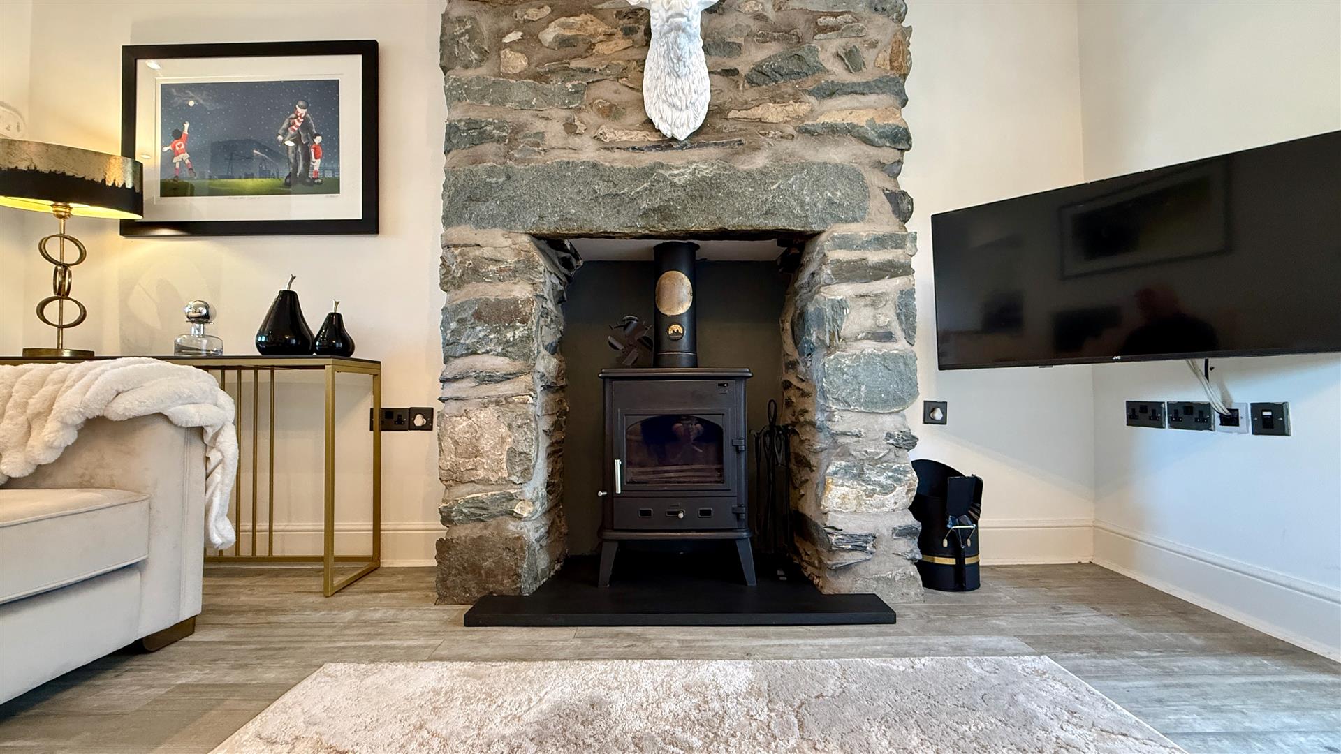 Open plan to the high end kitchen beyond, this welcoming cosy lounge benefits from a wood burning stove (installed 2024) on slate hearth set within traditional inglenook stone fireplace. There is a deep bay window to the front with recessed spot lights over which forms a lovely extra seating area. In addition there is space for a dining table and chairs and a useful under stairs cupboard.