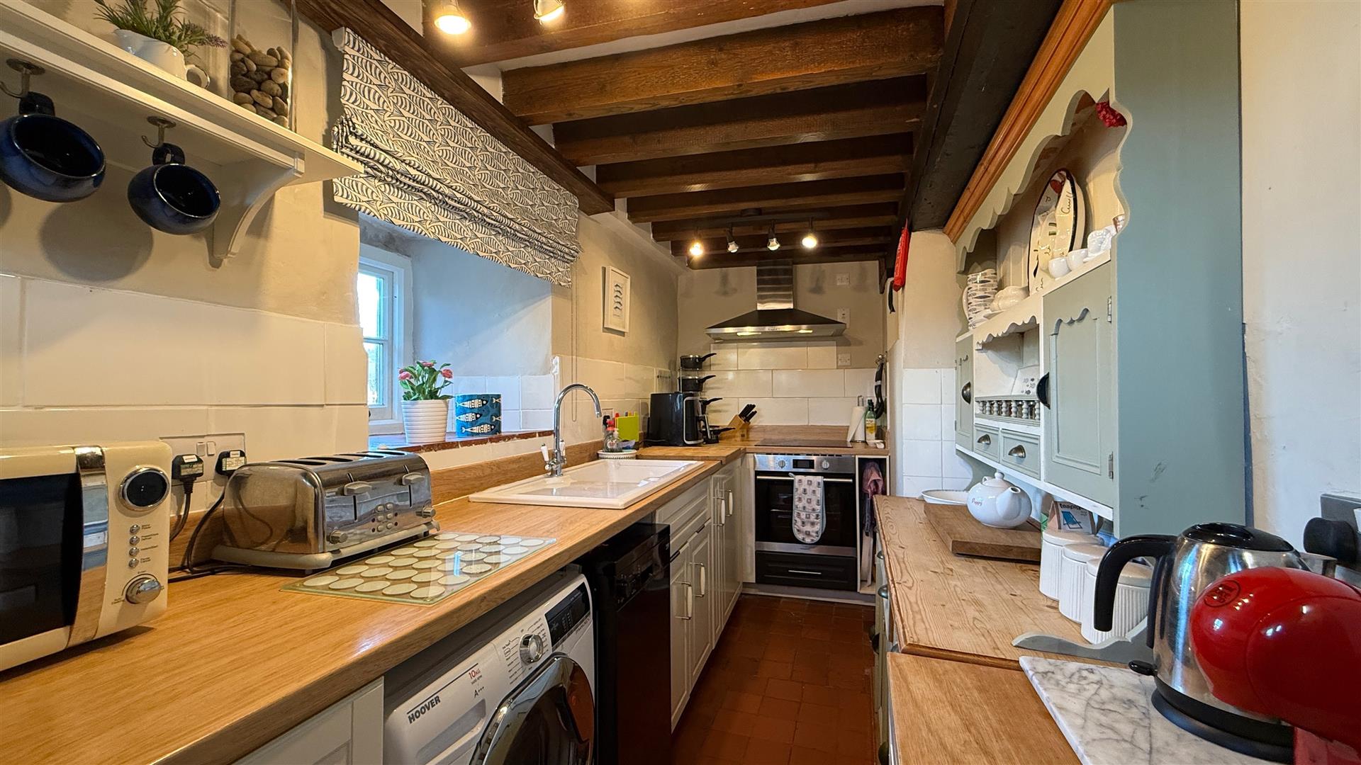 With dual aspect windows to the side with deep sills and a range of base units with wood effect counter over, Belfast sink, space and plumbing for a washing machine, space and plumbing for a slim line dishwasher, space for fridge, built in oven with hob. There are exposed beams, quarry tiled flooring and a useful under stairs pantry cupboard. An additional window looks out to the entrance hallway.