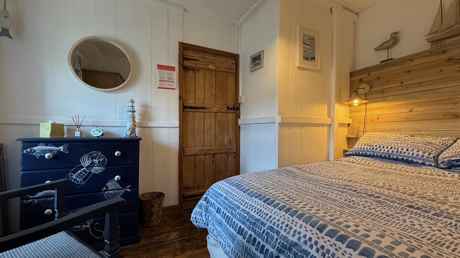 With part timber clad walls, exposed floor boards and window with sea and rural views.