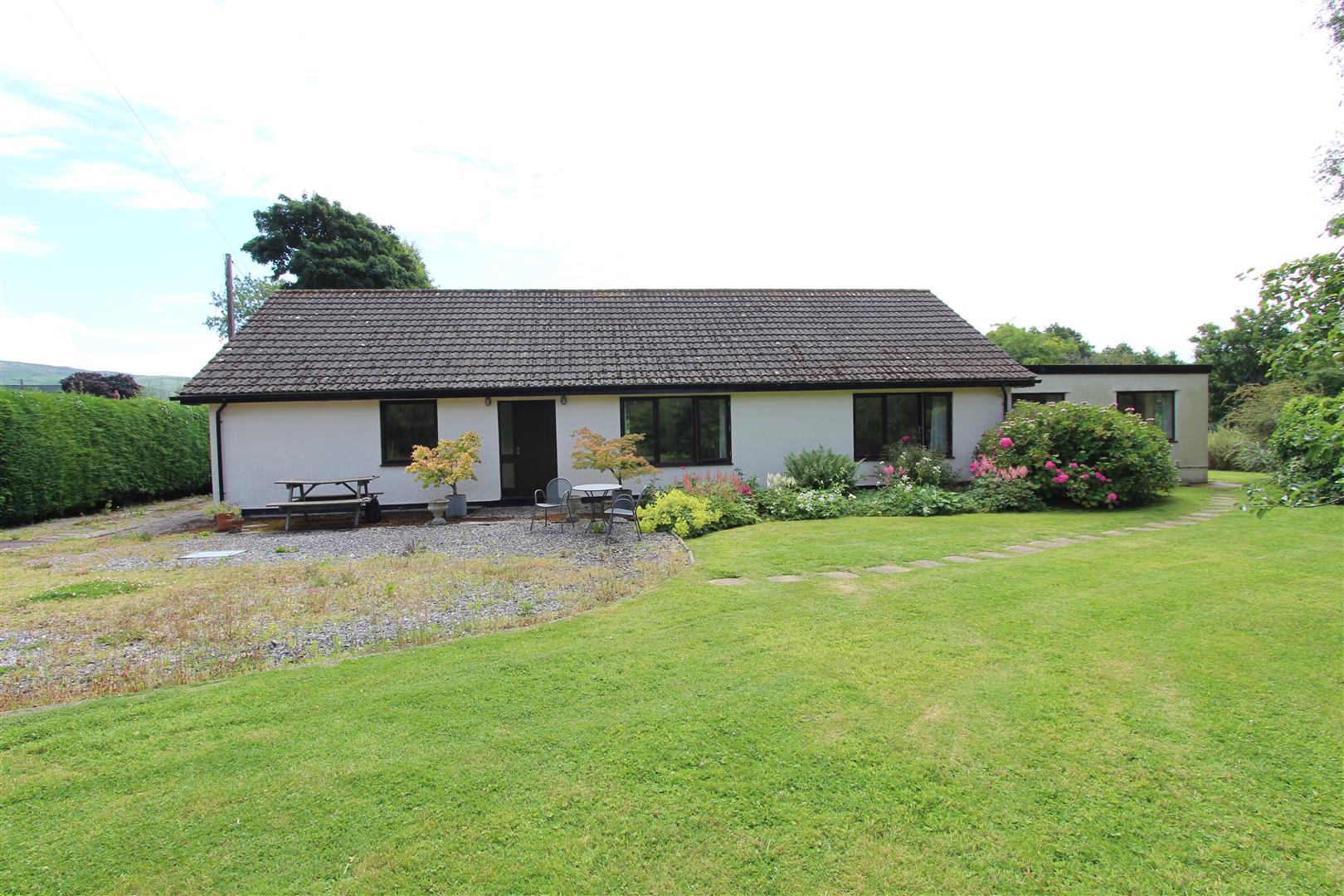 Built by the current owners, this extension was finished to a high standard with an exposed A-frame joist with doors leading out to the patio areas and views of the land beyond. The room has a log burner on a slate bed with wall-mounted uplights. Original plans can be viewed at the property.