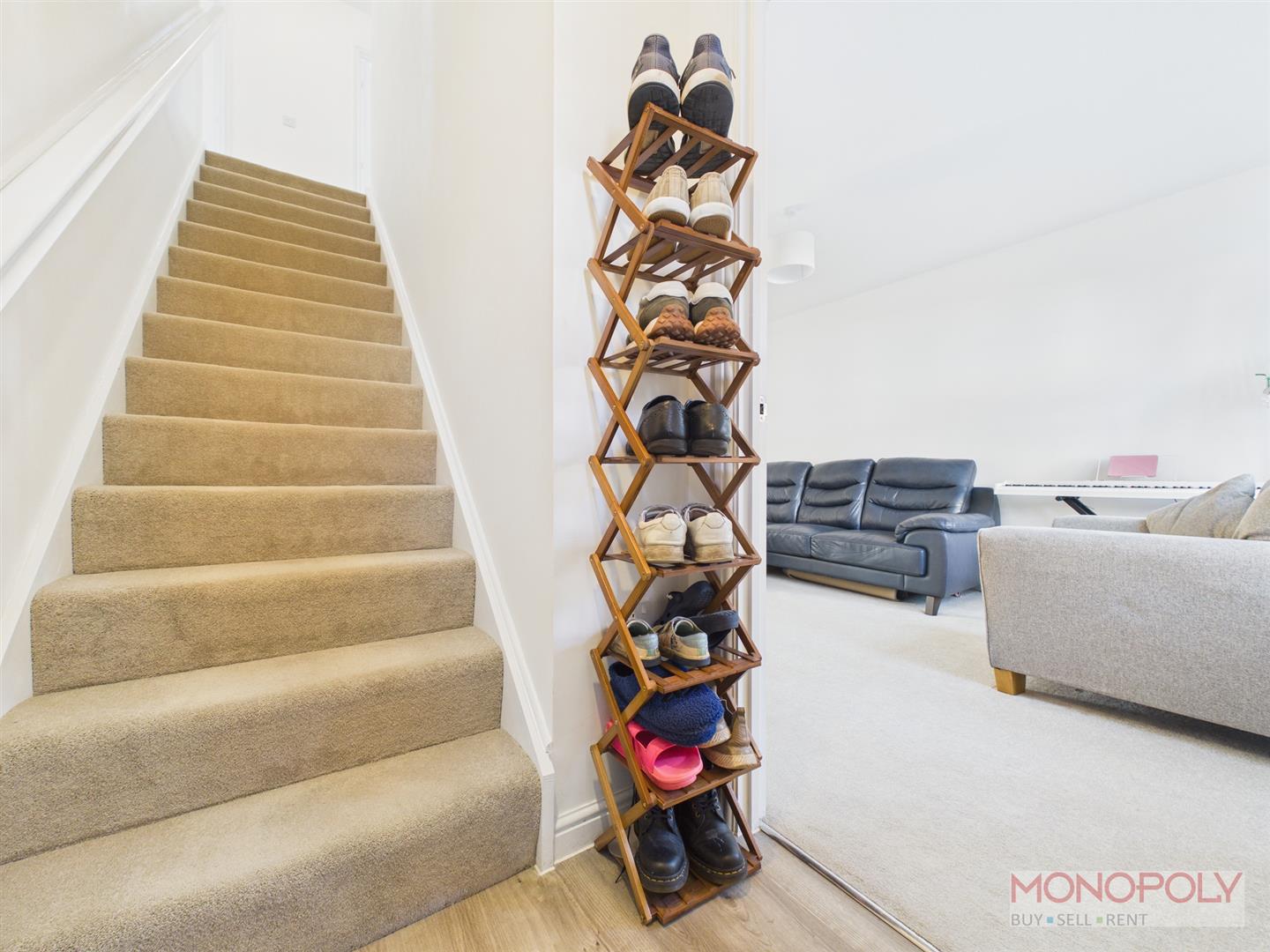 A welcoming entrance hallway with ceiling light point, wood effect flooring, door into the lounge and stairs rising to the first floor.
