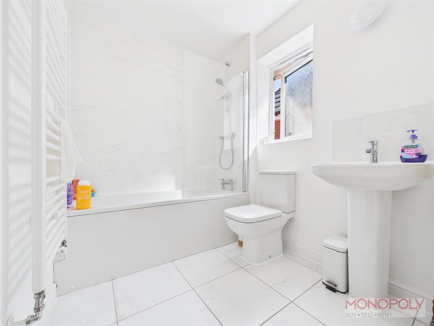A modern three-piece suite comprising a low-level W.C. with dual flush, pedestal hand wash basin with mixer tap over and panelled bath with shower over. Heated towel rail, extractor fan, tiled flooring, part tiled walls and uPVC double glazed window to the side elevation.