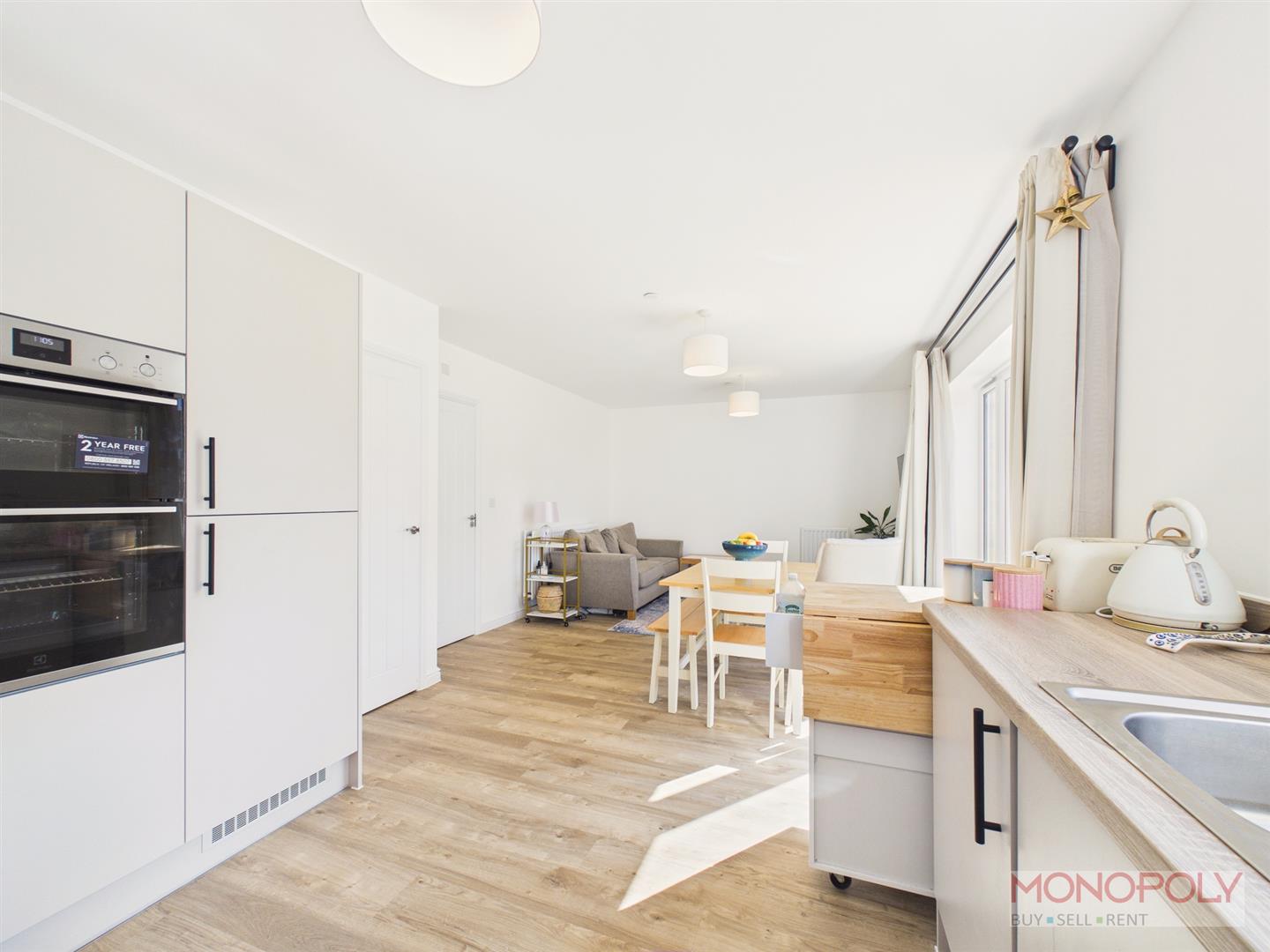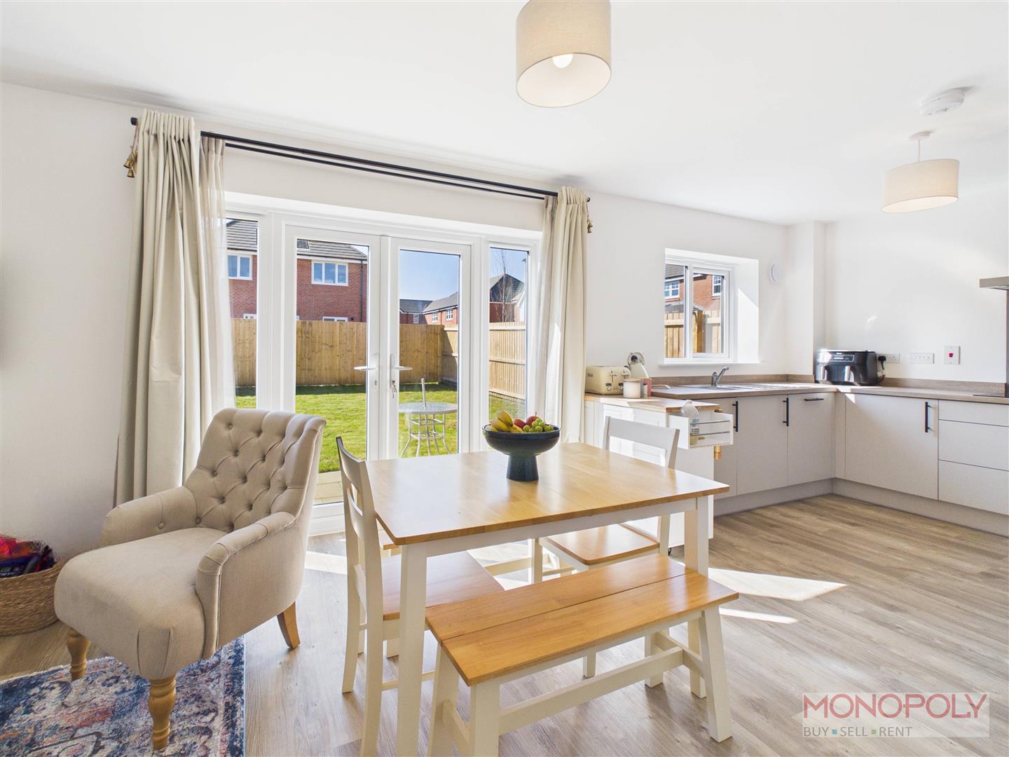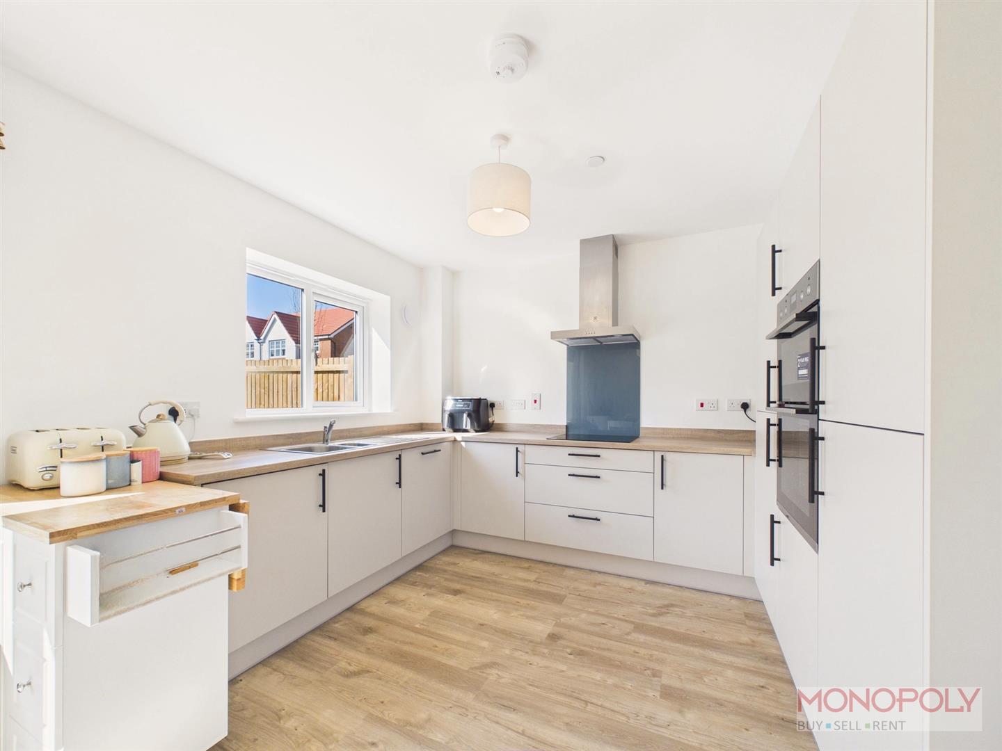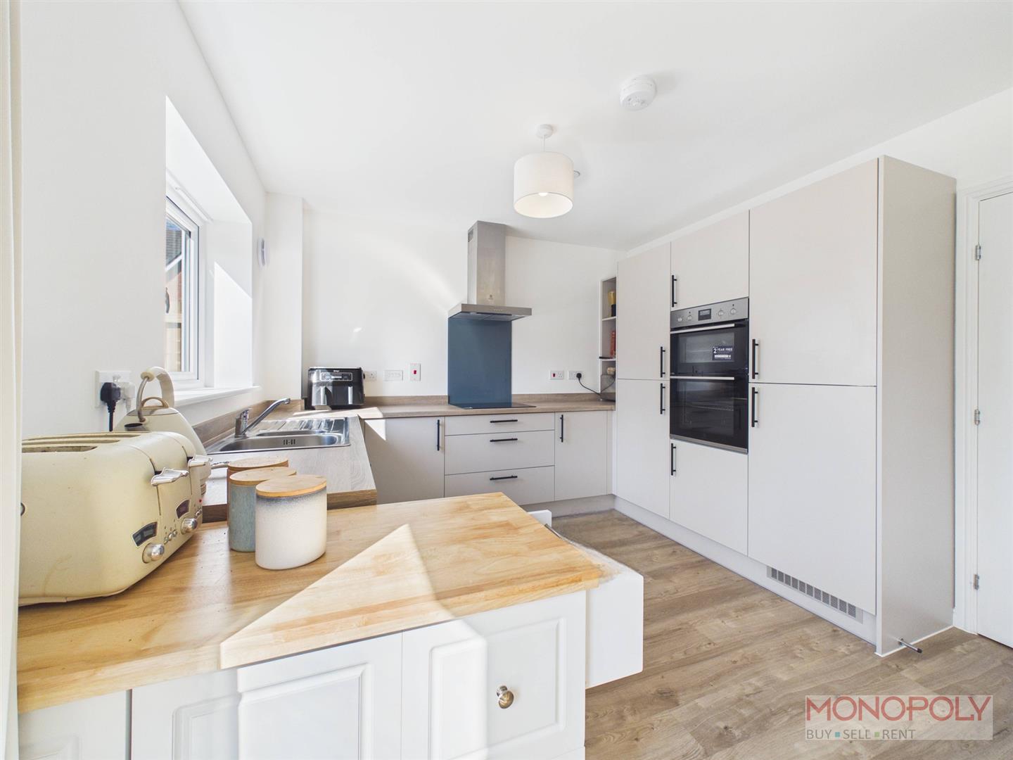 A contemporary kitchen housing a range of wall, drawer and base units with complimentary worktop over incorporating a 1.5 stainless steel sink and drainer unit with mixer tap over. Integrated appliances to include a dishwasher, electric double oven and grill, four ring induction hob with extractor fan over and fridge-freezer. UPVC double glazed window to the rear elevation, wood effect flooring and open-plan layout into the dining area.