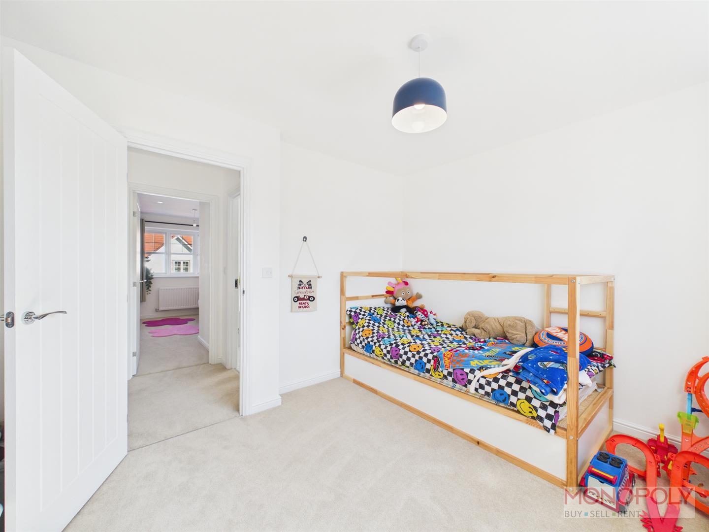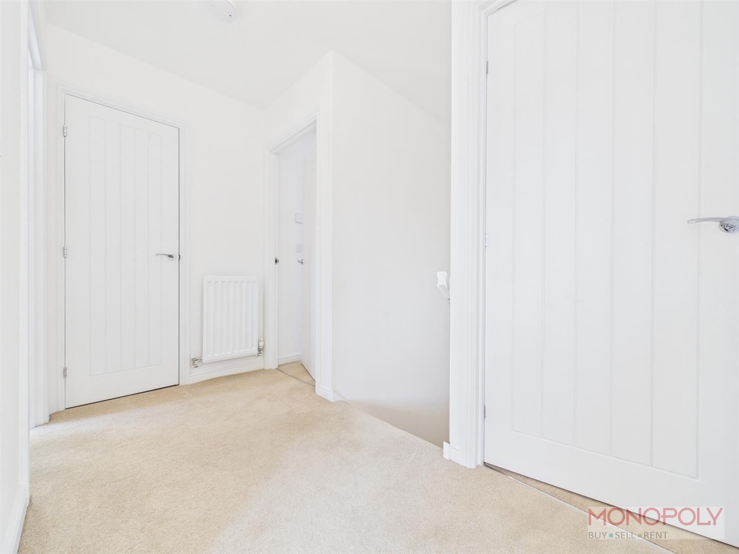 Carpeted flooring, access to the loft, door into a storage cupboard and doors off to the bedrooms and bathrooms.