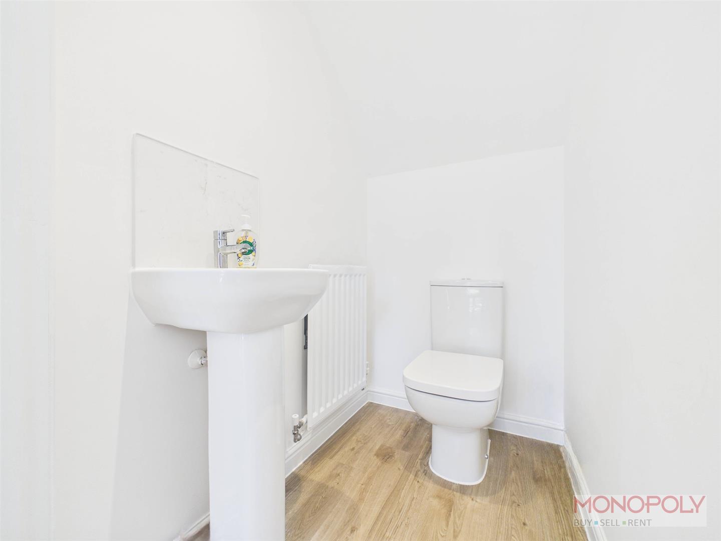 A two-piece suite comprising a low-level W.C. with dual flush and pedestal hand wash basin with mixer tap over and splash back. Wood effect flooring, extractor fan and radiator.