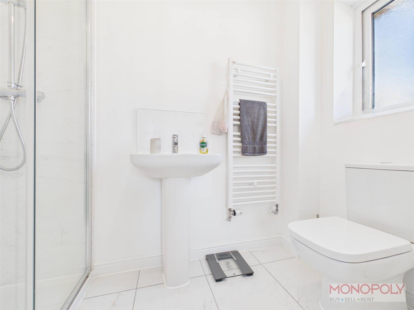 A contemporary three-piece suite comprising a low-level W.C. with dual flush, pedestal hand wash basin and walk-in shower with rainfall shower head over. UPVC double glazed window to the side elevation, tiled flooring, splash back and extractor
