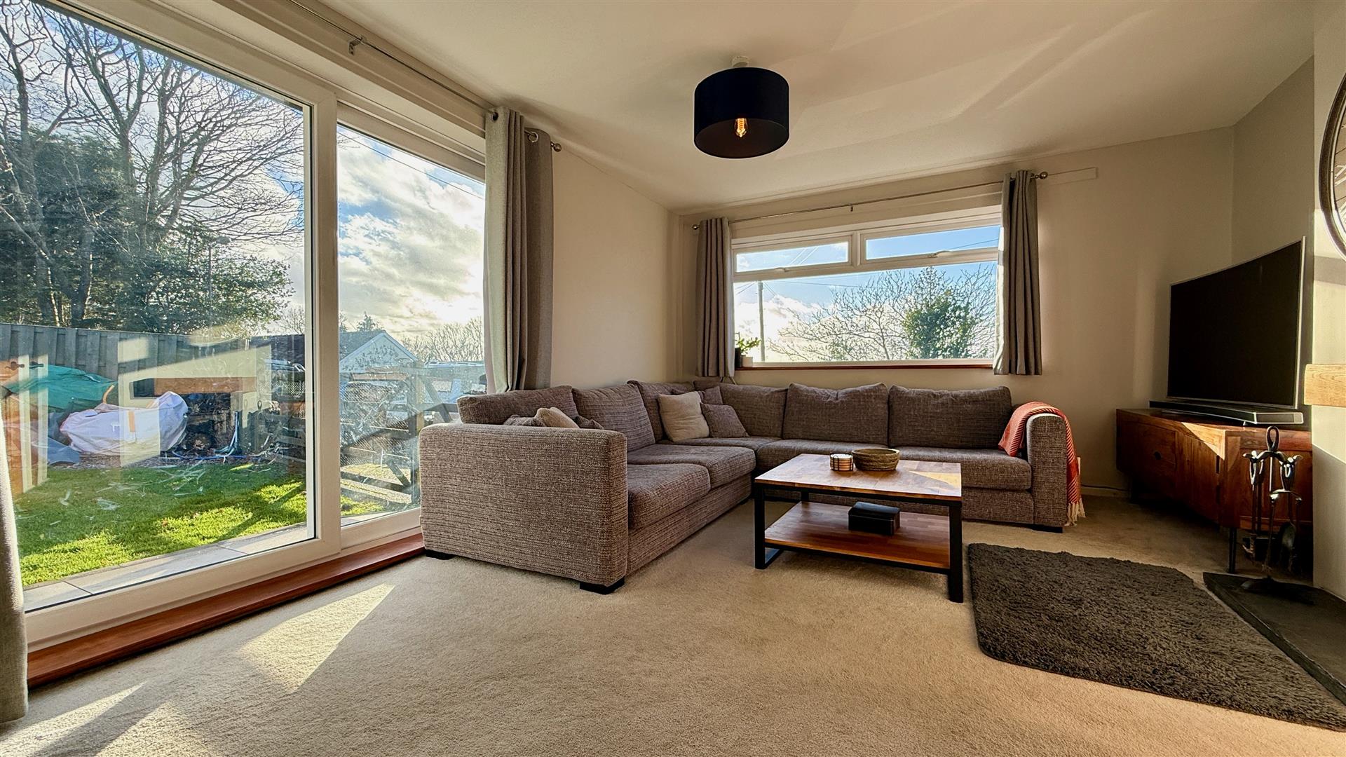 Spacious contemporary living room with sea views and cosy log burning fire on slate hearth with wooden mantle over. Bright and airy with dual aspect window and patio door opening to the garden.