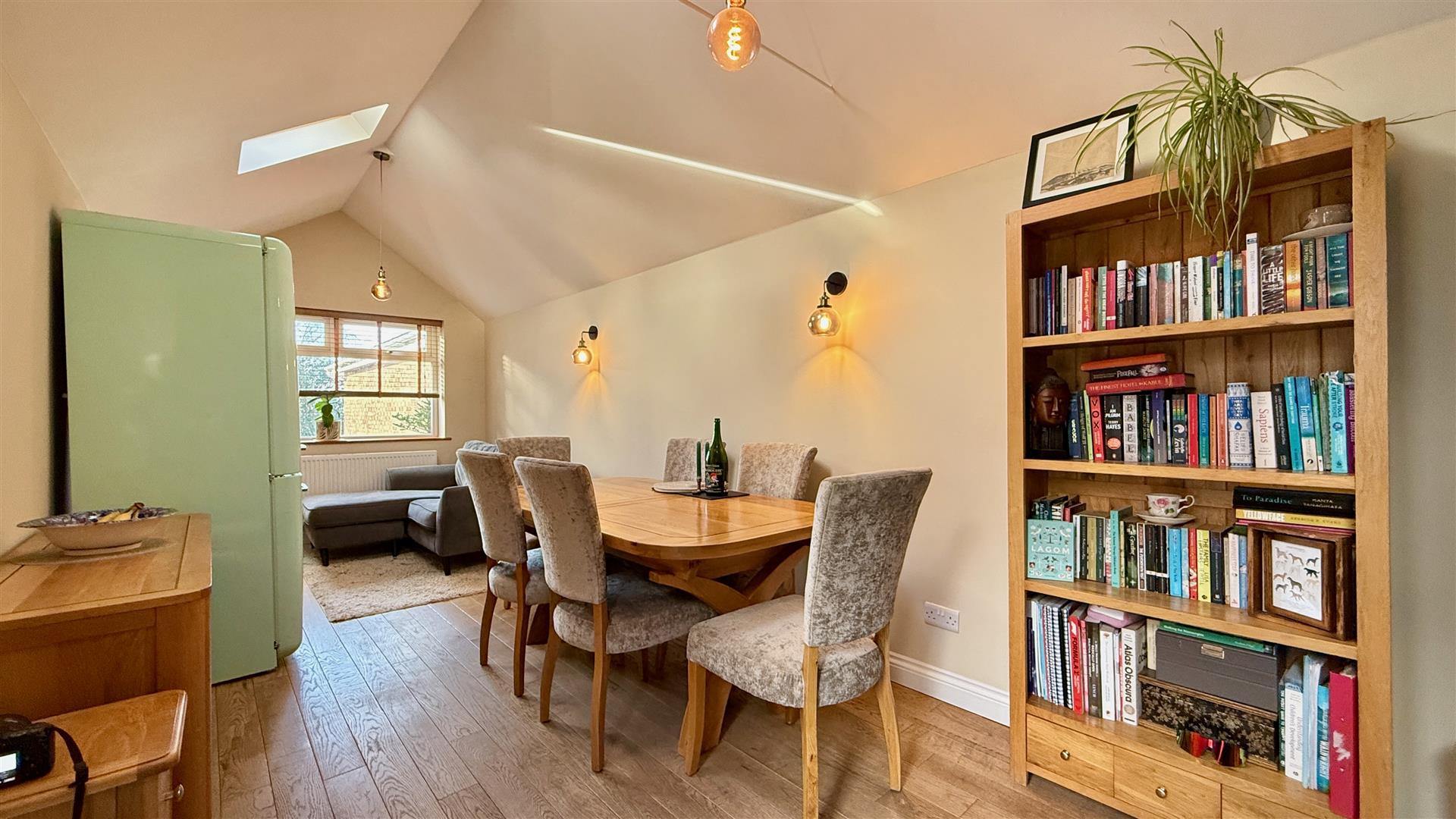 A stand out dining area with high vaulted ceiling and two roof light windows, solid oak flooring and log burning stove. Patio doors lead to the garden.