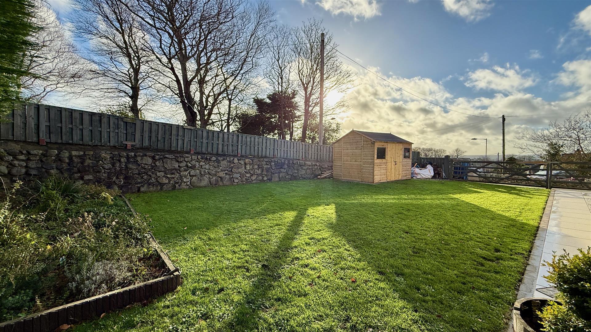 The property sits on a larger than average corner plot with a spacious driveway to the front for several cars and sea views. A gated entrance leads to the private and sunny garden which is totally enclosed with lawns, patios, gravel seating areas, mature bushes and shrubs.