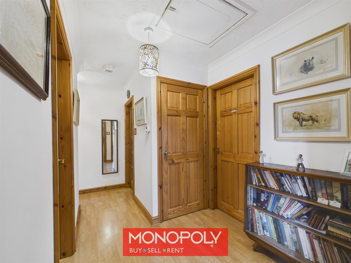 A spacious central hallway with matching flooring, coved ceiling, radiator, and doors leading to all principal rooms. Additional features include a storage cupboard with radiator and a hatch with pull-down ladder to a part-boarded attic, ideal for storage.