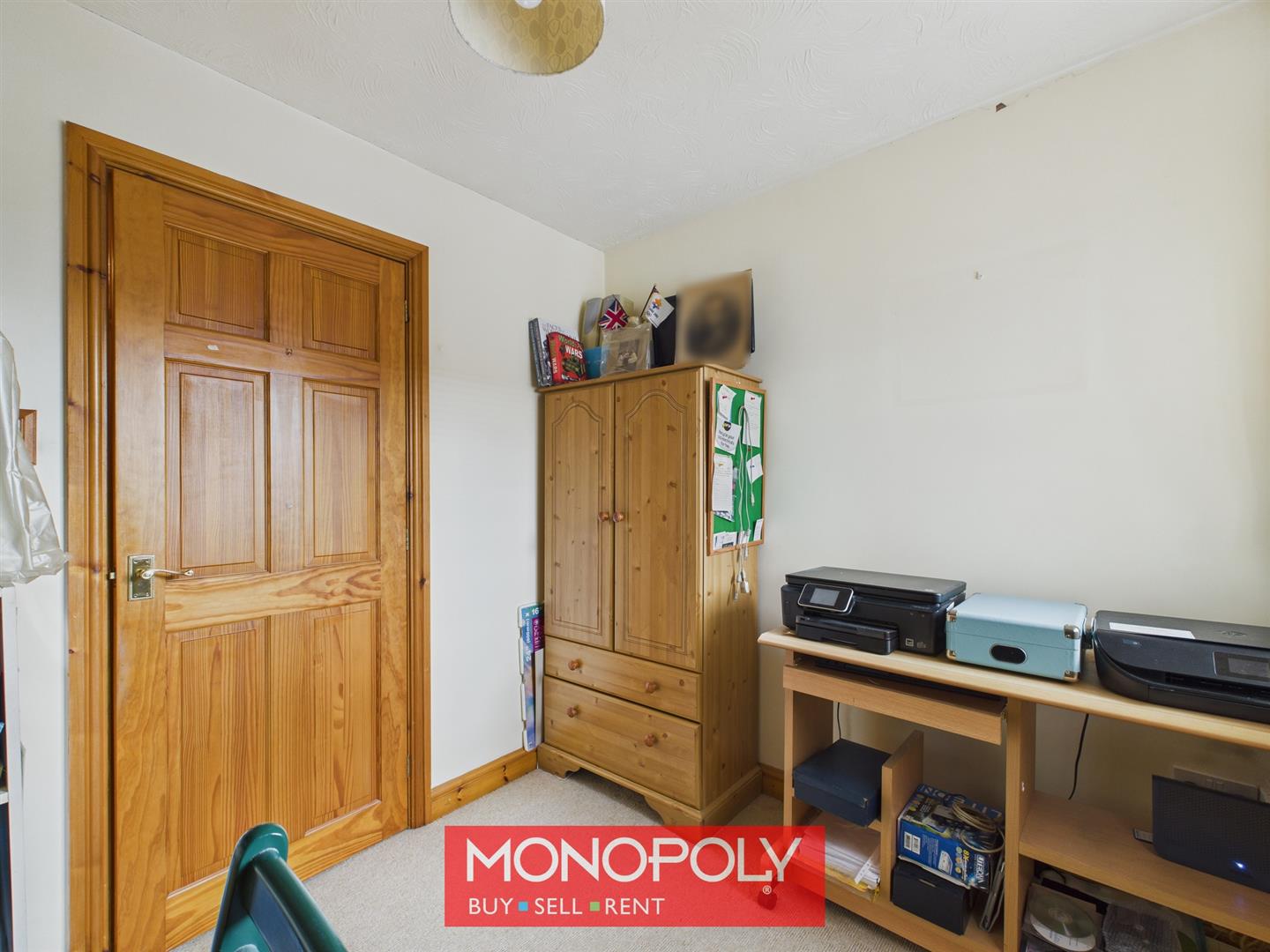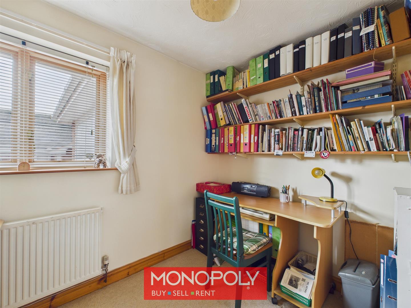 A single bedroom currently used as a home office, featuring carpeted flooring, radiator, and double-glazed window.