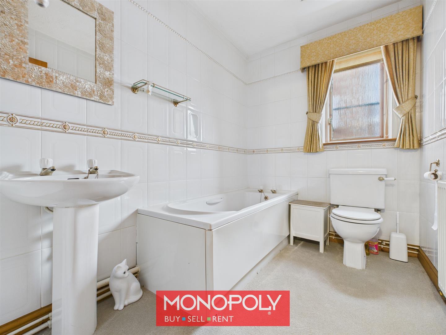 The main bathroom comprises a three-piece suite including a deep bath, WC, and pedestal wash basin. Fully tiled walls with a decorative border, privacy window with pelmet, radiator, extractor fan, and a carpeted floor.