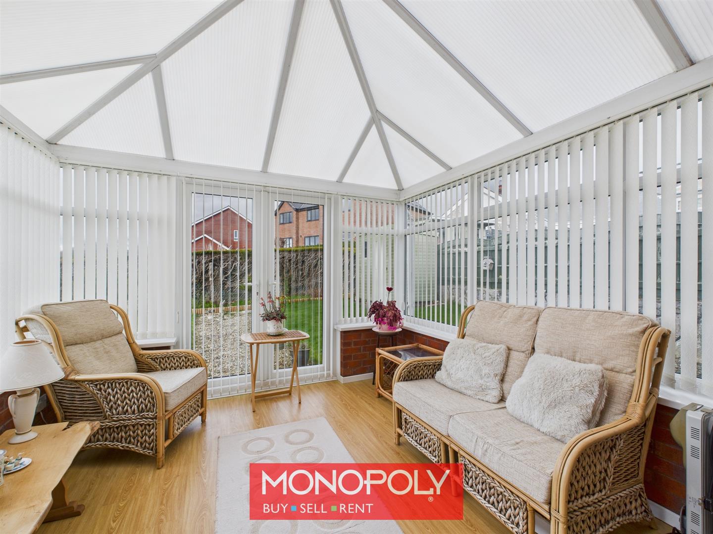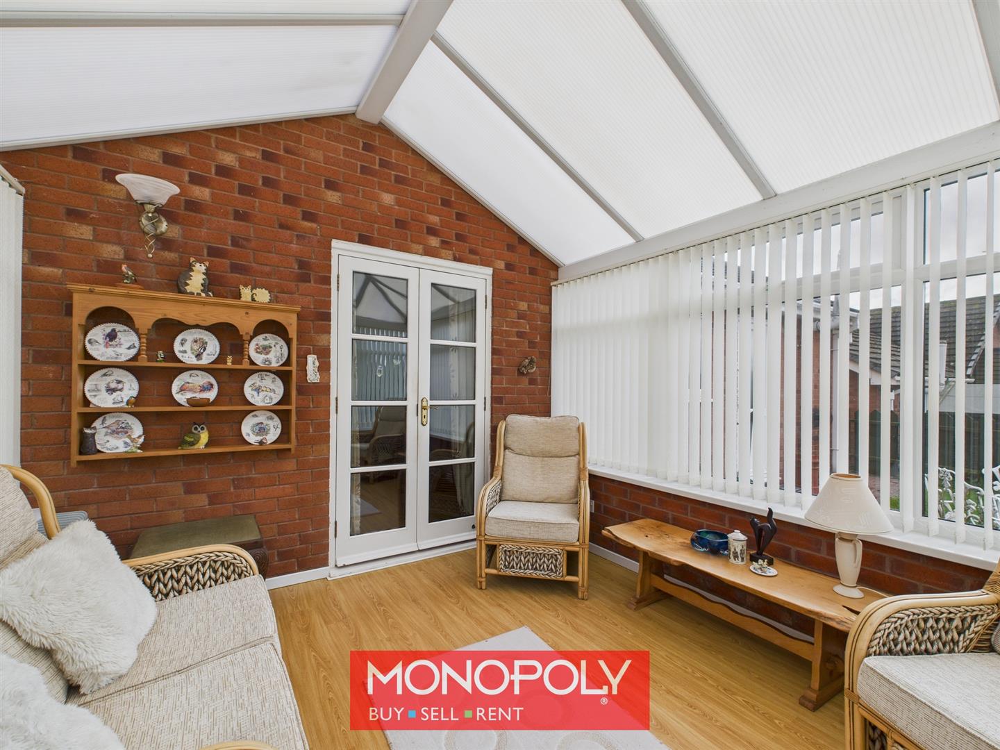 An Edwardian-style conservatory with laminate wood-effect flooring, double-glazed windows with vertical blinds, and a polycarbonate roof. French doors lead out to the rear garden, making this an ideal additional sitting or dining area. Equipped with sockets.