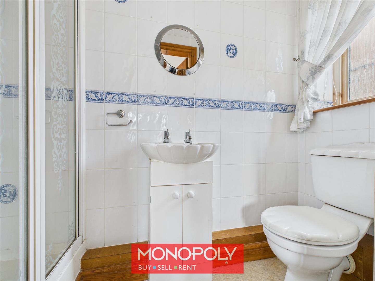 Fitted with an enclosed shower with thermostatic control, vanity unit with hand-wash basin, WC, fully tiled walls with decorative border, radiator, privacy window, and extractor fan.