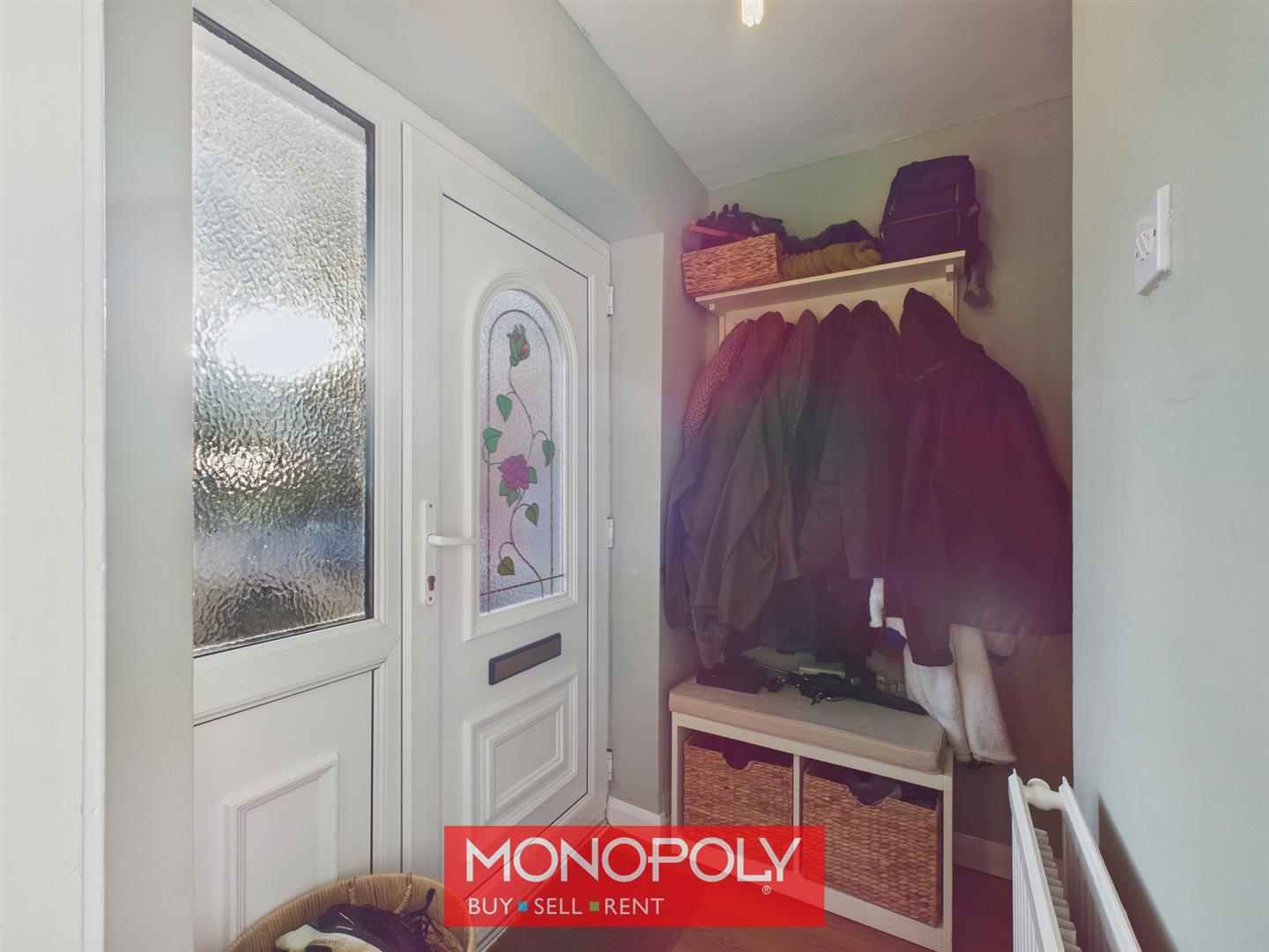 A welcoming entry hallway features durable laminate flooring and a uPVC front door with an attractive decorative glass panel, providing access to the carpeted staircase and a wooden door leading through to the lounge.