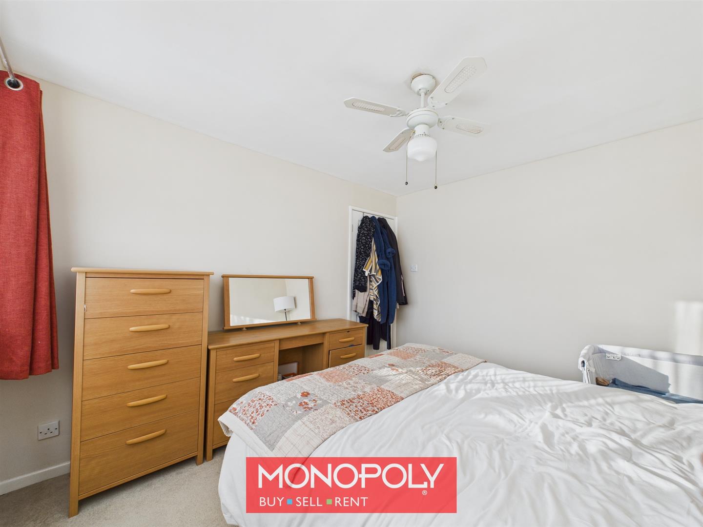 The master bedroom is a comfortable carpeted double room with a front-facing double-glazed window, a radiator beneath, and a ceiling fan with integrated light fitting for added comfort.