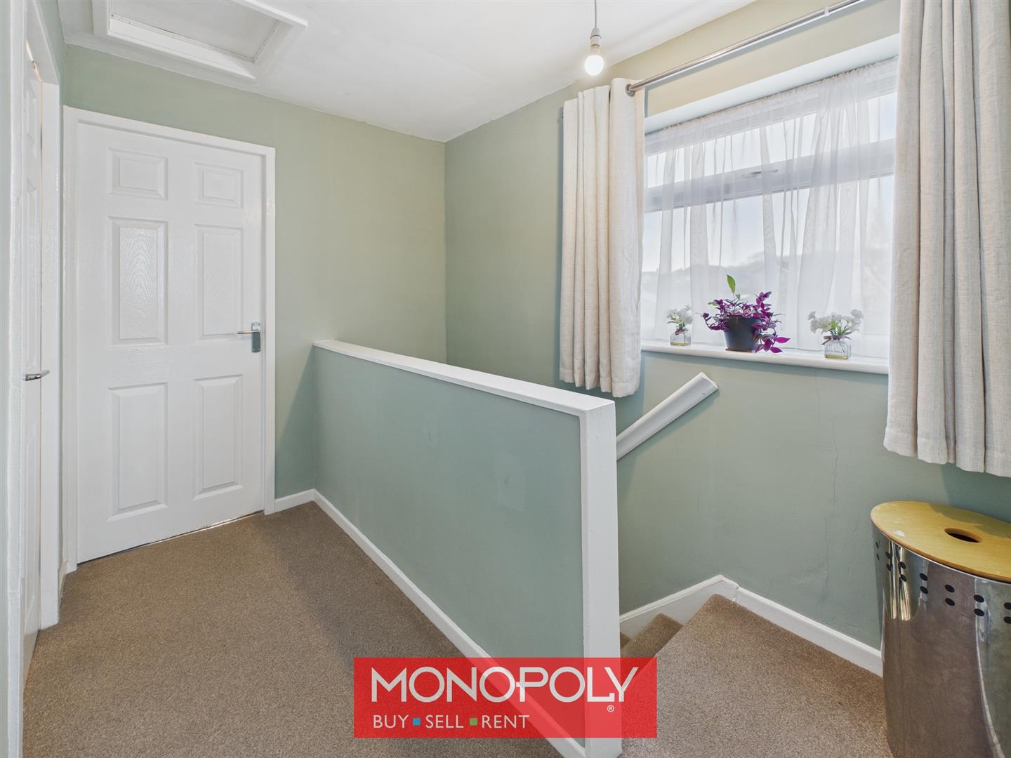 Carpeted stairs lead to a carpeted landing, naturally lit by a double-glazed window overlooking the side of the property, with a loft access hatch neatly positioned above.