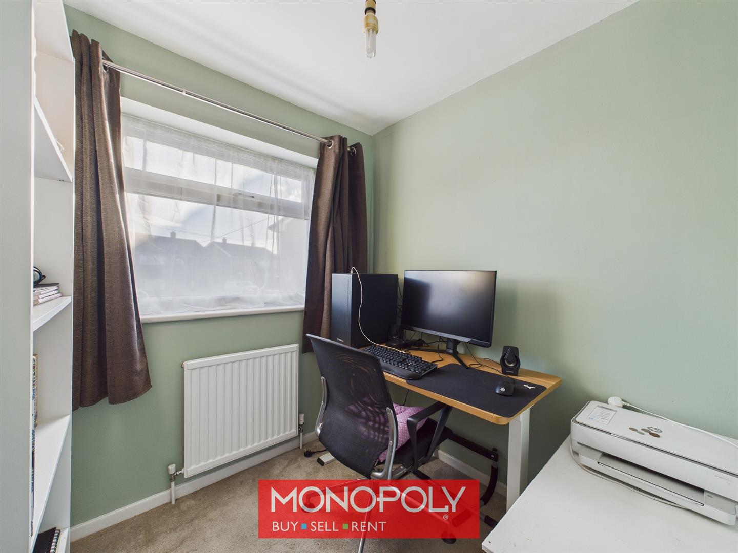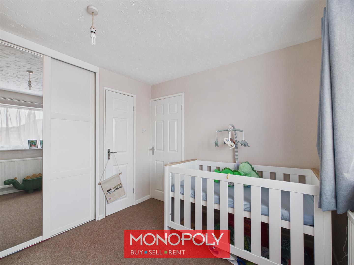 Bedroom three is a well-proportioned carpeted room with a front-facing double-glazed window and a radiator positioned below.