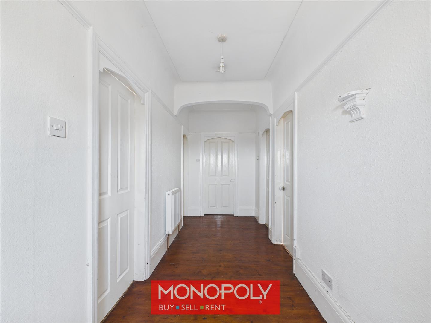 The hallway showcases original exposed wooden flooring and a UPVC front door. Decorative coving and a dado rail frame the space, with doors branching to the lounge, master bedroom, bedroom two and the kitchen–diner. A radiator and conveniently placed coat hooks complete the area.