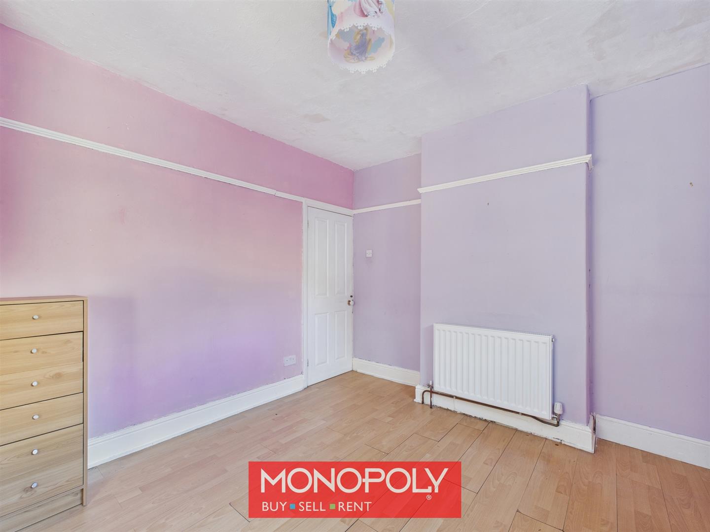 A serene room featuring wood-effect laminate flooring, classic coving, a dado rail and a radiator. A large box-bay window enhances natural light and adds a spacious feel.