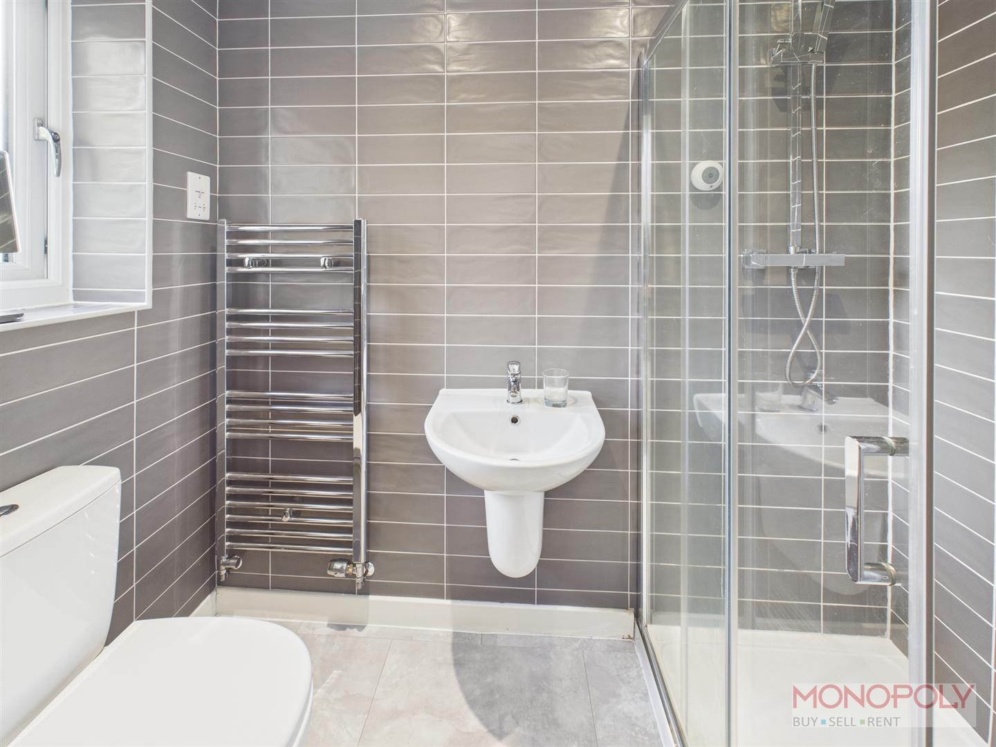 Comprising of dual sized shower cubicle, wash hand basin, dual flush low level w.c. Chrome ladder style radiator/ towel rail. UPVC Double glazed and frosted window to the front, tiled walls, spotlights to the ceiling.