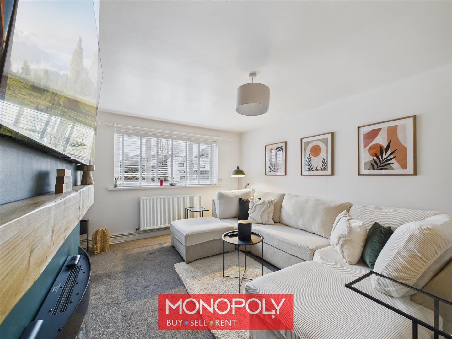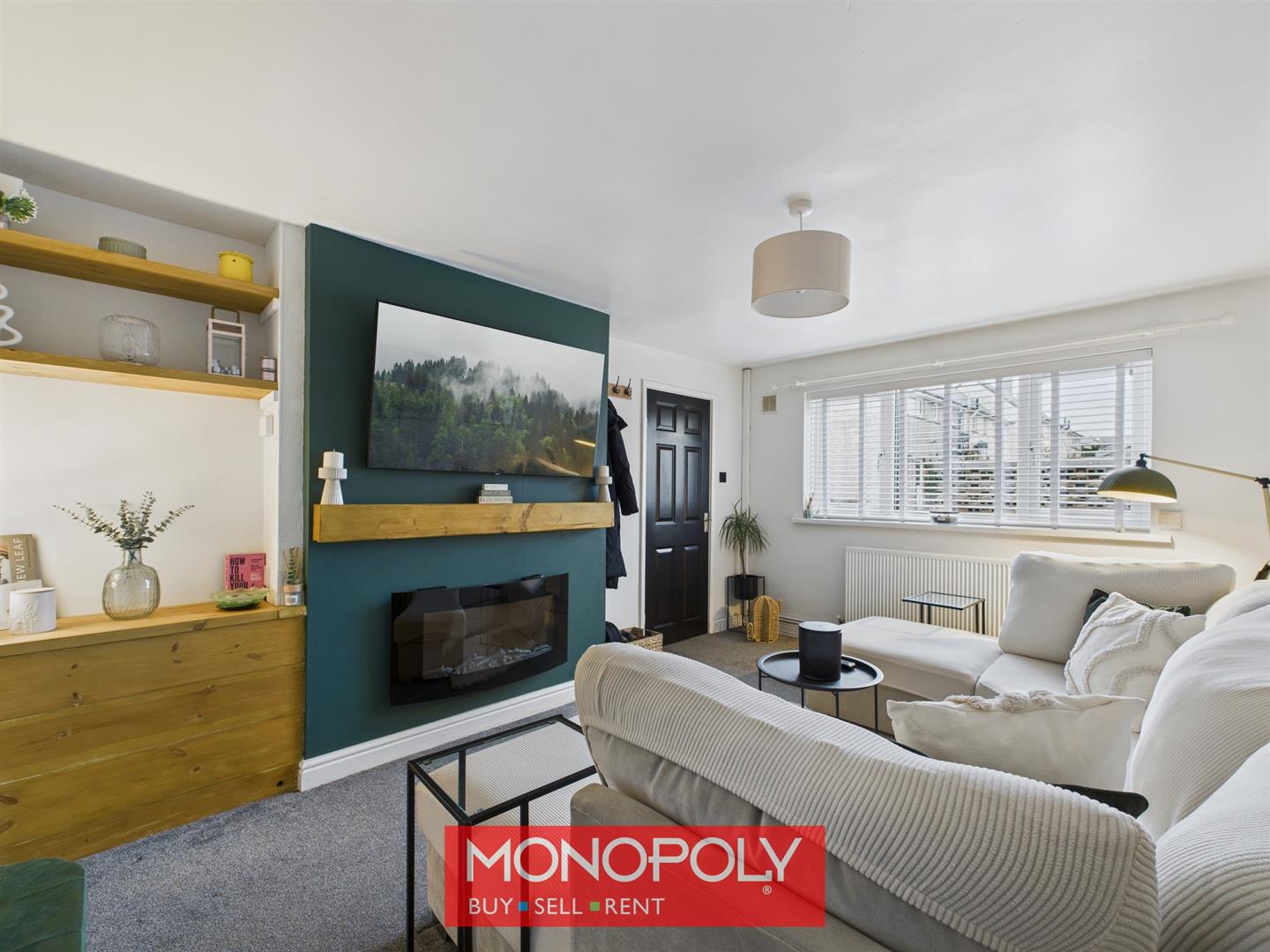 A welcoming lounge with carpeted flooring, features a central wall-mounted electric fire with an attractive wooden mantel. A front-facing window allows for ample natural light, with a radiator underneath and a door provide access to the staircase and first-floor landing.