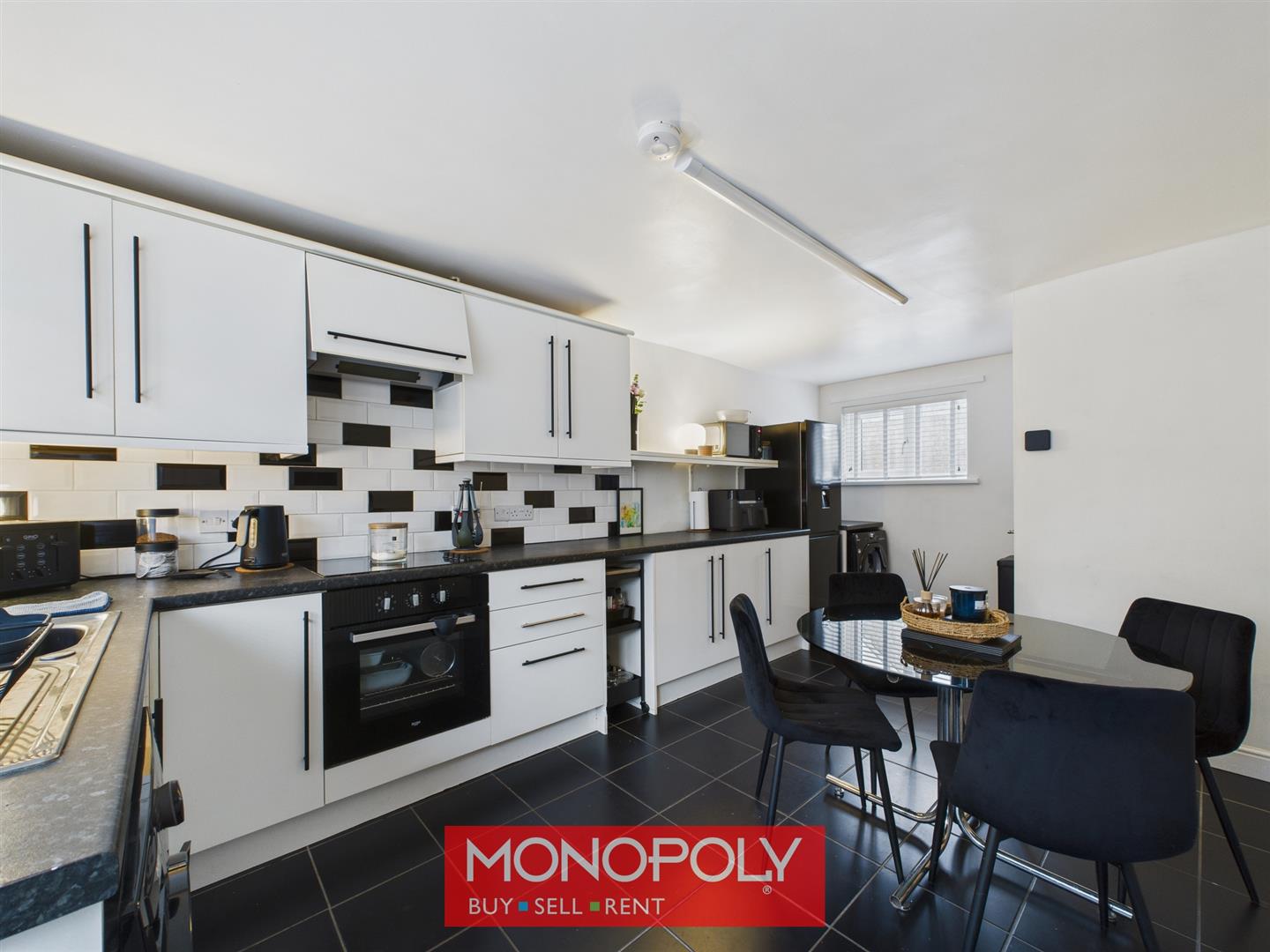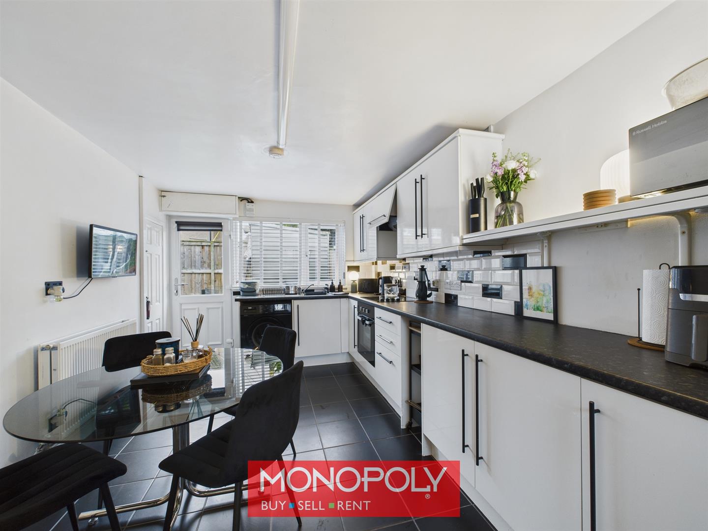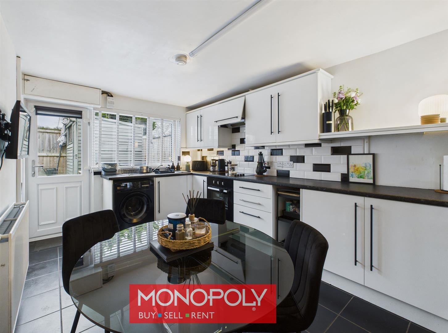 A spacious kitchen diner fitted with a range of modern white kitchen units, complemented by black granite effect worktops and tiled splashbacks. Appliances include an electric oven, induction hob, stainless steel sink, and spaces for a washing machine, tumble dryer, and tall fridge freezer. The tiled floor, radiator, and strip lighting add to the practicality of the space. Dual-aspect windows to the front and rear enhance natural light, with additional features including a useful under-stair storage cupboard, consumer unit, and uPVC external door leading to the rear garden.