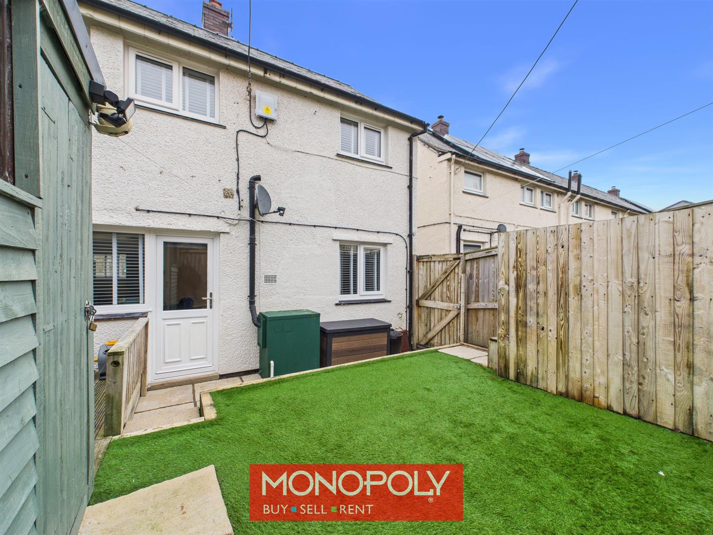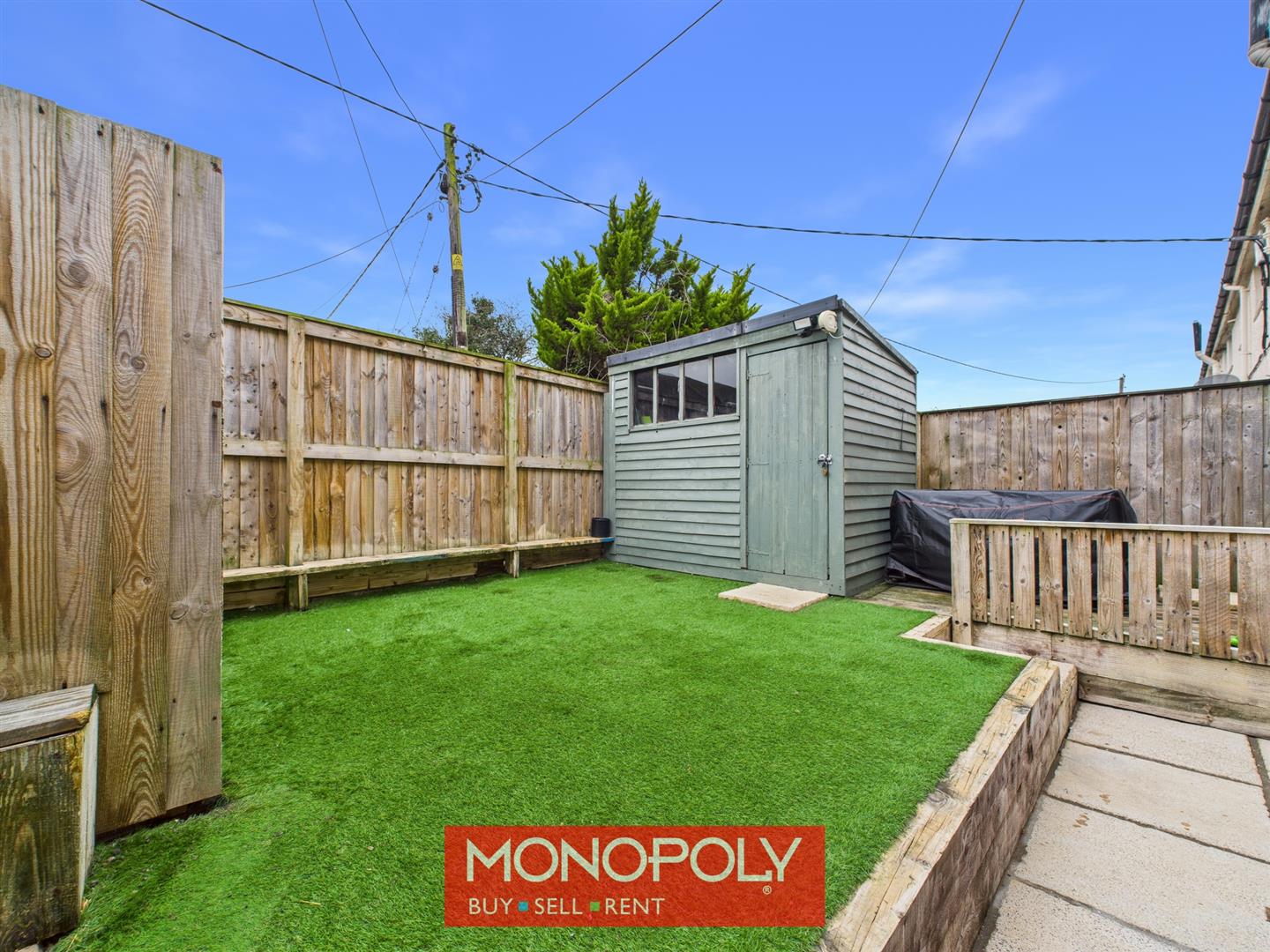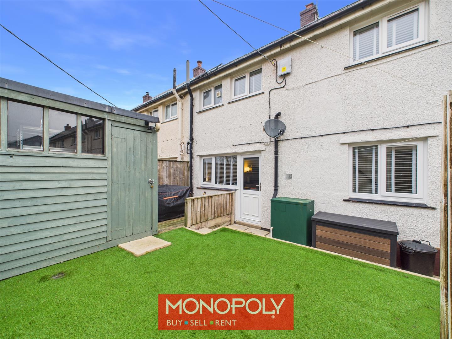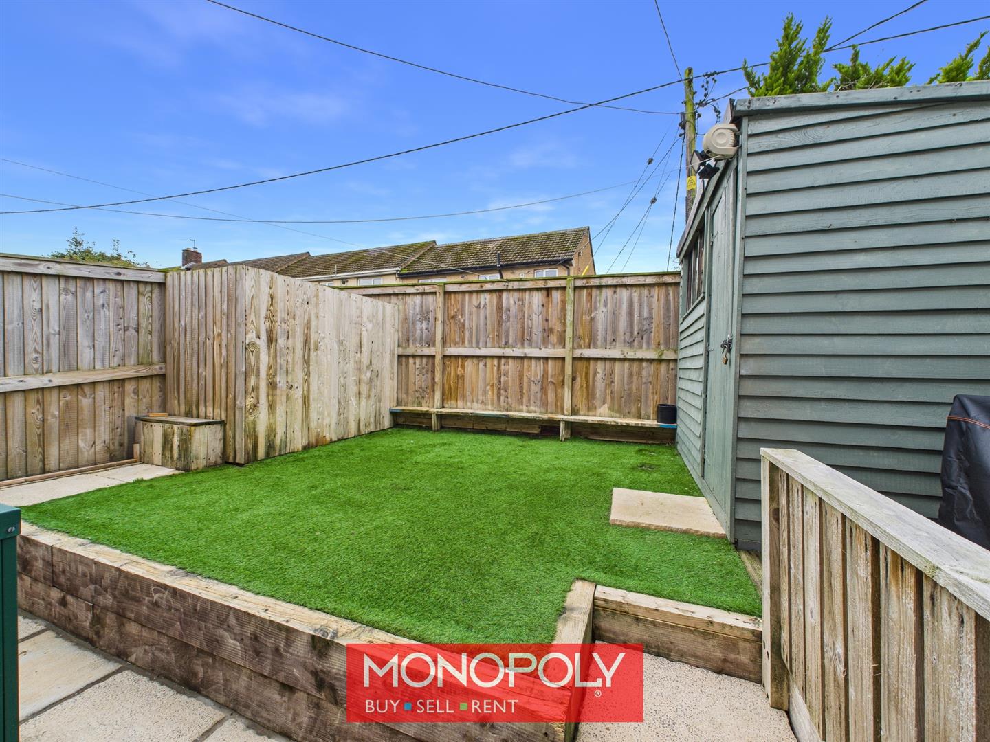 The enclosed rear garden is arranged over two tiers and designed for low maintenance, featuring astro turf, a paved pathway, and a decked patio area ideal for outdoor seating. A timber shed with power and lighting offers excellent storage or workshop potential. The garden also houses the oil boiler and is fully enclosed with high fencing and a timber gate.